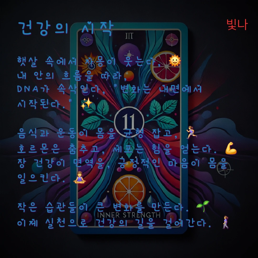 타로 카드의 "내면의 힘"은 우리가 변화와 치유의 시점을 맞이할 때, 내면의 에너지를 회복하고 변화를 받아들이는 중요성을 강조한다. 이 카드와 자몽의 에너지는 비슷한 메시지를 전달한다. 자몽은 대사를 촉진하고, 스트레스를 해소하는 데 도움을 주어, 내면의 흐름을 원활하게 한다. 마찬가지로, "내면의 힘" 카드는 우리가 두려움 없이 변화를 받아들이고 자신감을 가지고 나아가야 한다는 메시지를 전달한다. 몸과 마음의 균형을 맞추는 것, 그것이 바로 타로 카드와 자몽이 전하는 공통된 진리이다.