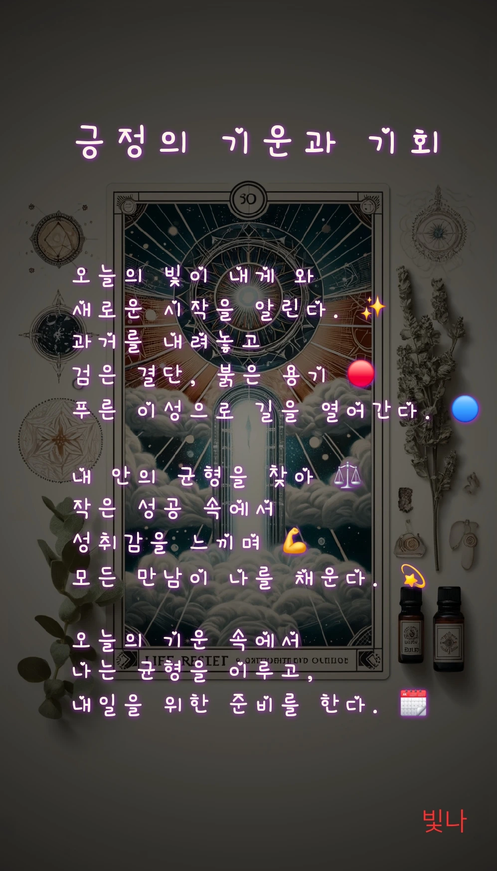 카드의 의미: 이 카드는 과거를 내려놓고 새로운 시작을 돕는다. 결단력과 균형을 맞추며, 직감력과 감수성을 높여준다. 불확실한 순간에 안정감을 주며, 삶의 방향을 재설정하고자 하는 사람들에게 도움이 된다.