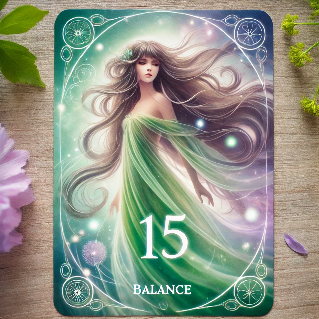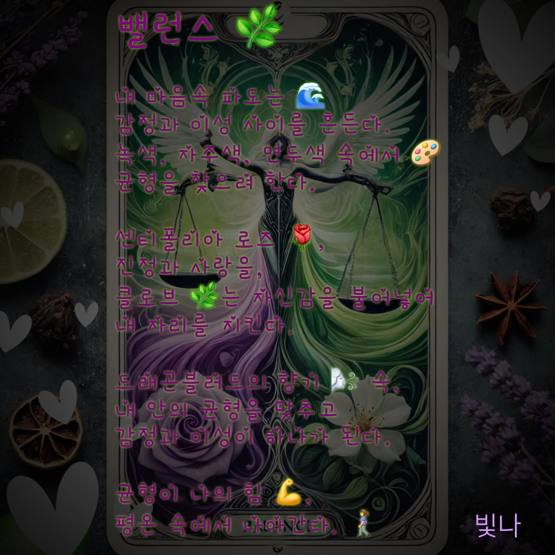 밸런스 카드는 감정과 이성의 균형을 찾고, 내면의 안정을 유지하도록 돕는 카드다. 센티폴리아 로즈의 감성적인 안정과 클로브의 자신감 강화를 통해, 위기 속에서도 흔들리지 않고 차분히 대처할 수 있는 힘을 준다. 삶의 불안정한 순간을 균형 있게 마주할 수 있도록 안내하는 역할을 한다.