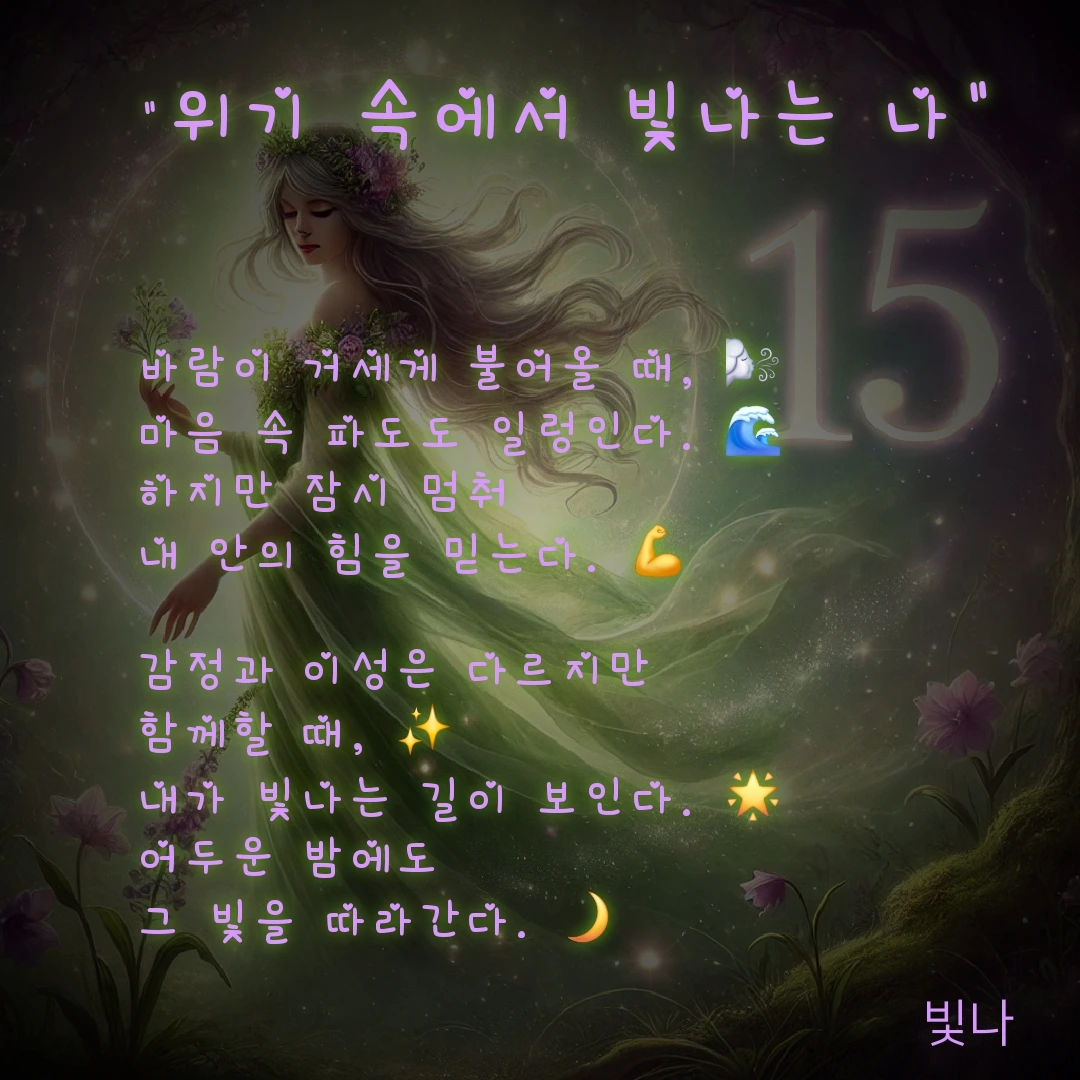 감성: "그럼 나는 왜 이렇게 빛나고 싶을까? 어릴 때부터 내가 잘할 수 있는 걸 찾으려고 했던 것 같아."