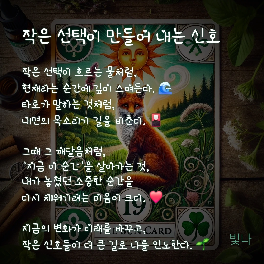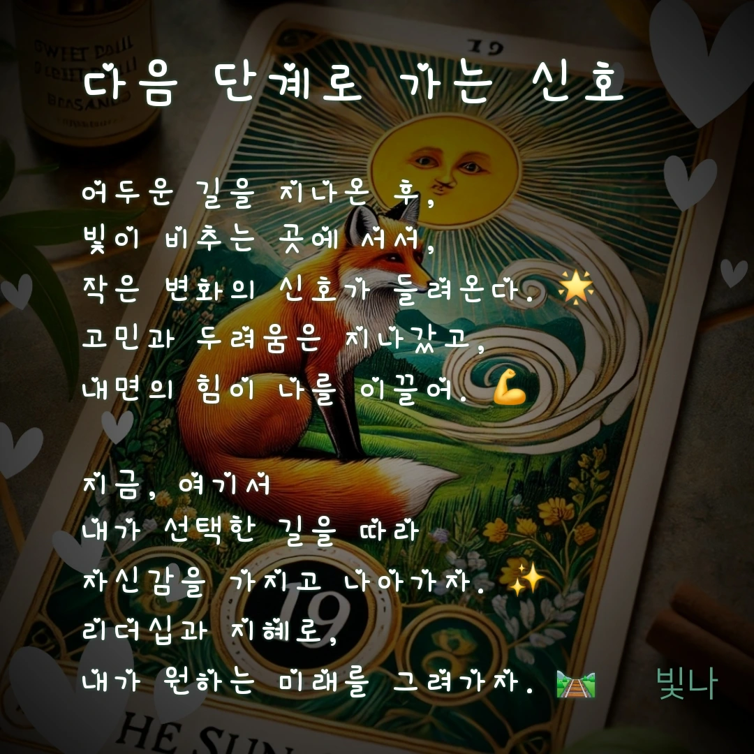카드 해석: 새로운 시작과 내면의 빛이 나를 이끌어간다. 불확실성은 내려놓고, 자신감을 갖고 나아갈 때.