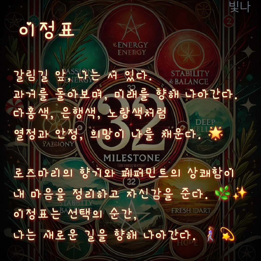 카드 의미: '이정표'는 인생의 전환점을 상징하는 카드로, 중요한 선택의 순간이나 새로운 시작을 알린다. 이 카드는 과거를 돌아보고, 미래를 향해 나아갈 준비가 되었음을 나타낸다.