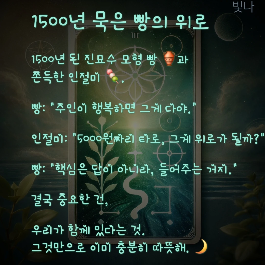 진묘수빵: 좋아. 다음에도 더 쫀득하고 진한 맛으로 반겨주자고. 공주의 시간은 오래됐지만, 그만큼 깊고 따뜻하니까. 주인이 그 온기를 오래 기억했으면 좋겠다.