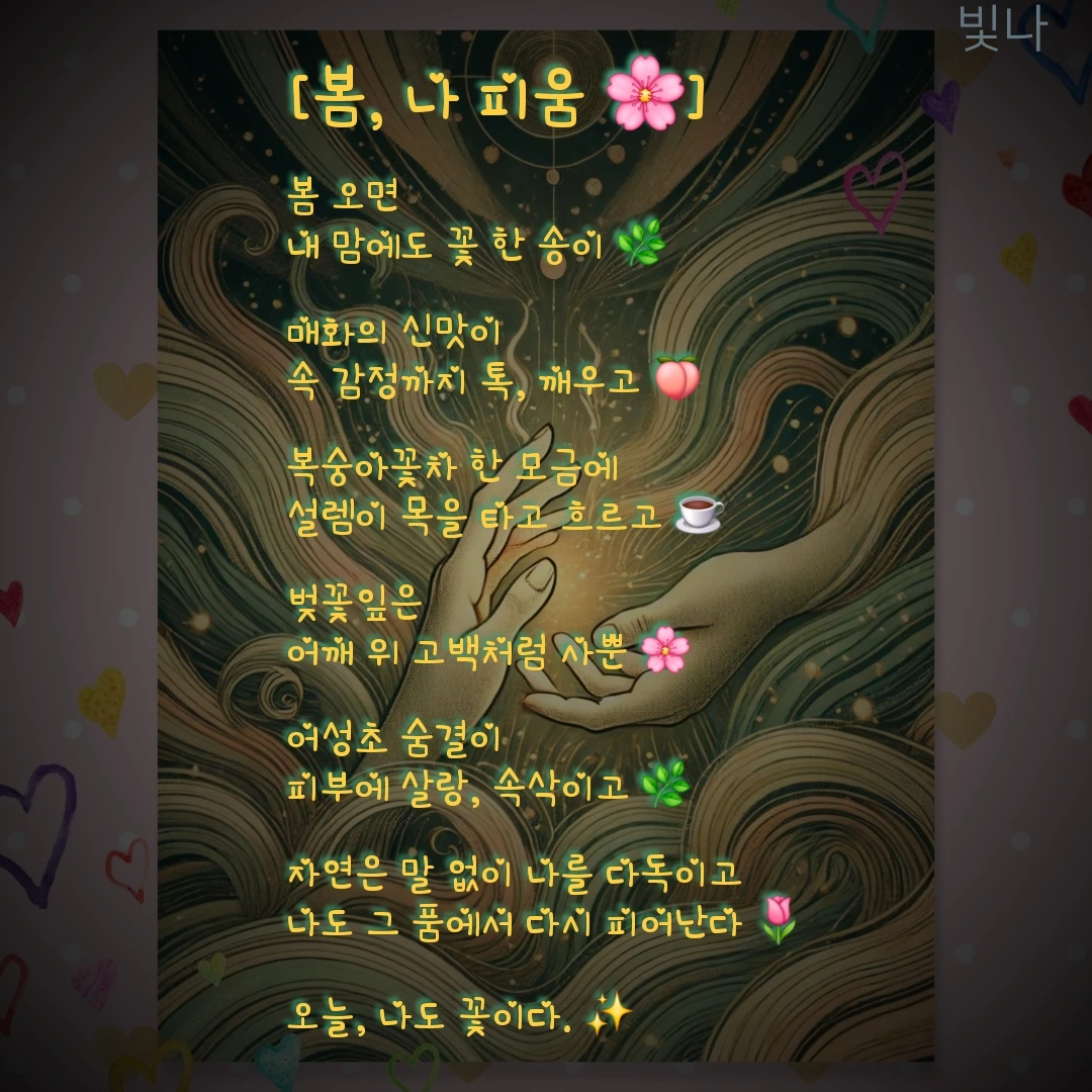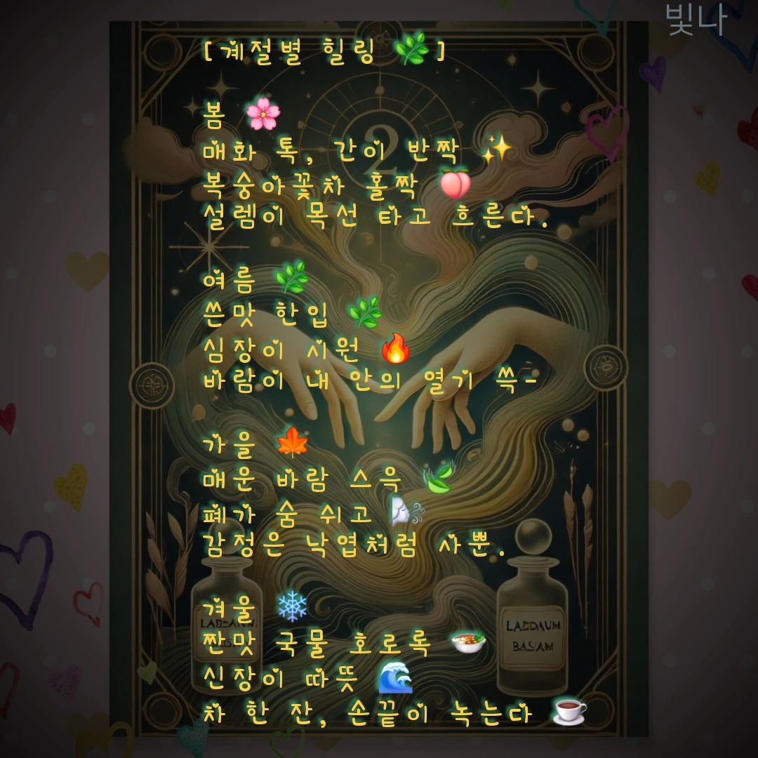 다음 계절이 오기 전에, 나만의 리듬을 따라 자연과 함께하는 힐링 루틴을 만들어 보는 건 어떨까? 계절마다 피어나는 향기와 맛, 그리고 감정의 흐름을 느끼며 나를 조금 더 사랑하는 시간.