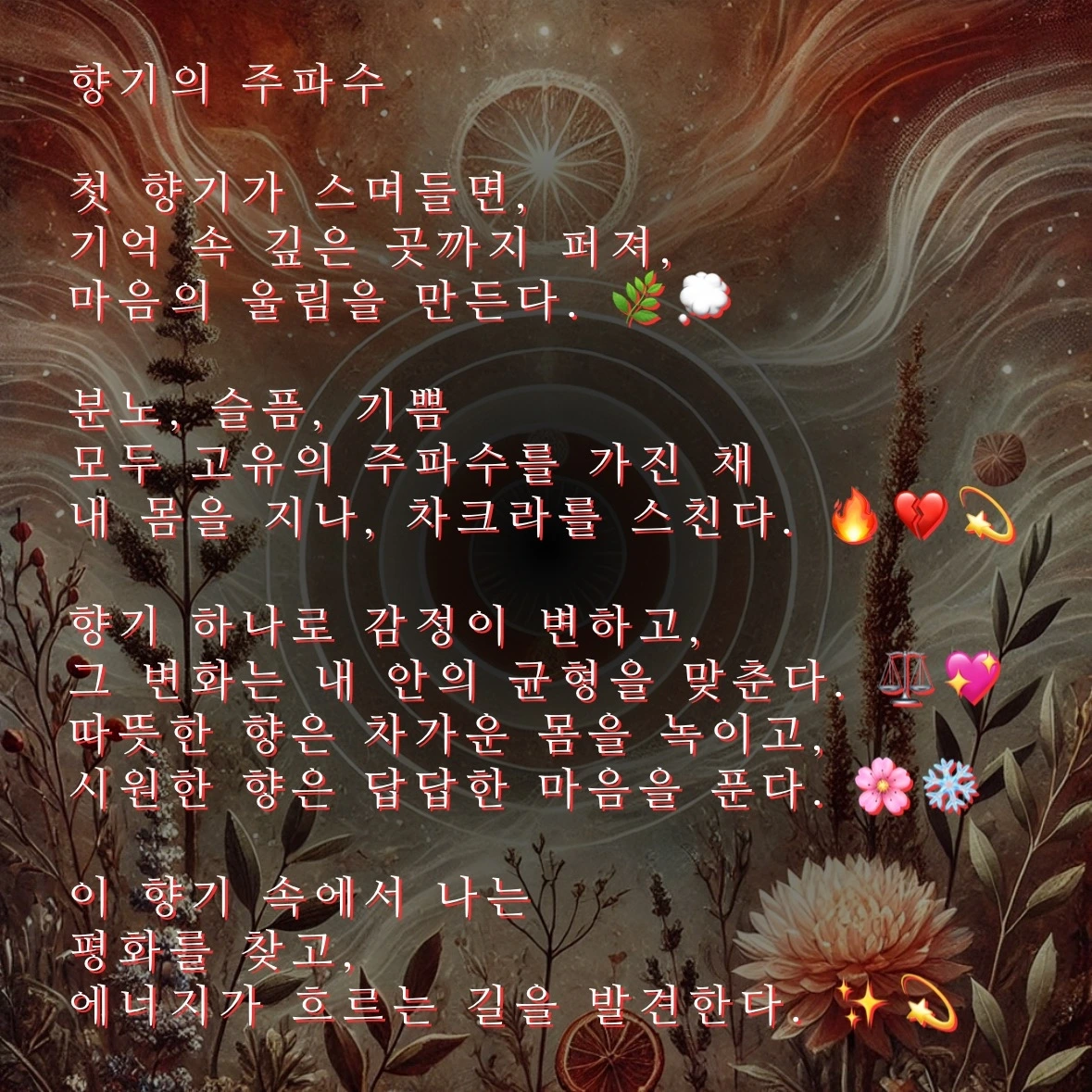 향기는 감정과 에너지를 조율하는 힘이 있다. 이 과정이 내 삶에 어떤 변화를 가져올지 기대된다.