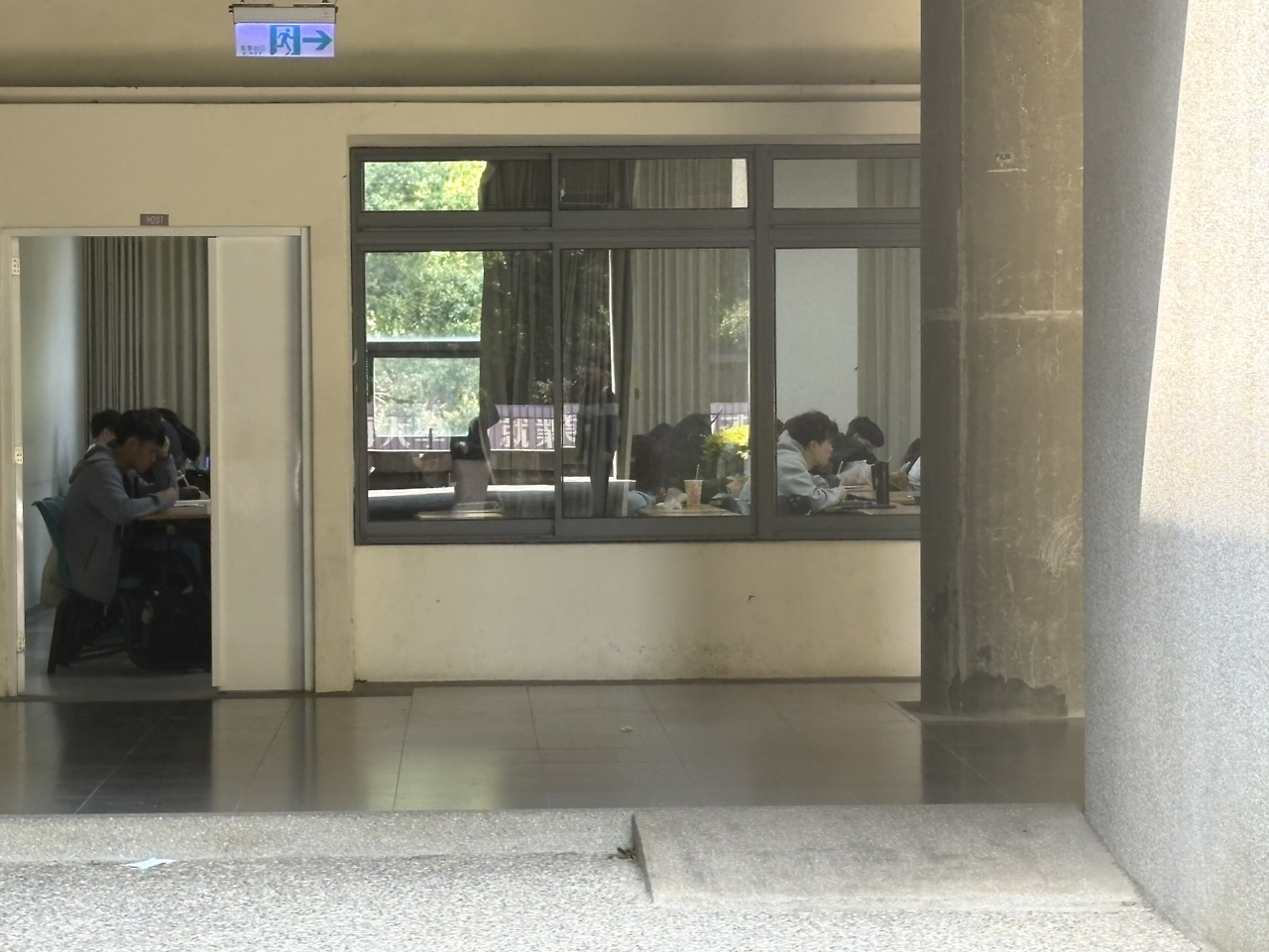 (강의실 앞, 졸린 얼굴로 걸어가는 학생들)