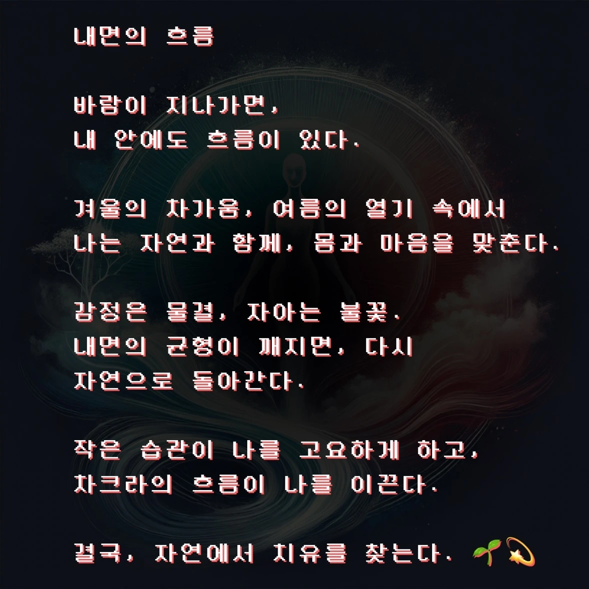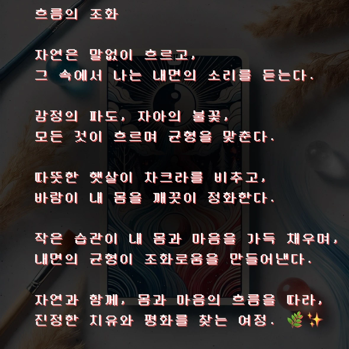 “감각의 흐름을 따라가며, 자연과 몸의 조화를 이루어라. 내면을 신뢰하고, 세상의 에너지를 열린 마음으로 받아들여라.”
