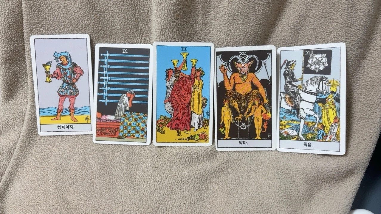 검 9(불안) · 컵 페이지(감정의 시작) · 악마(집착) · 죽음(전환) · 컵 3(회복)