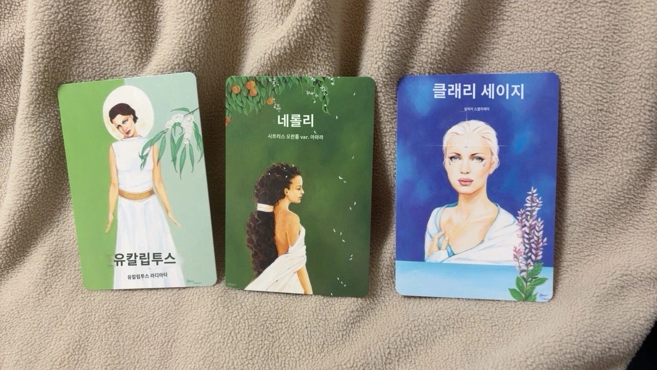 오늘 뽑은 인사이트 카드 세 장—네롤리, 유칼립투스, 클라리 세이지,