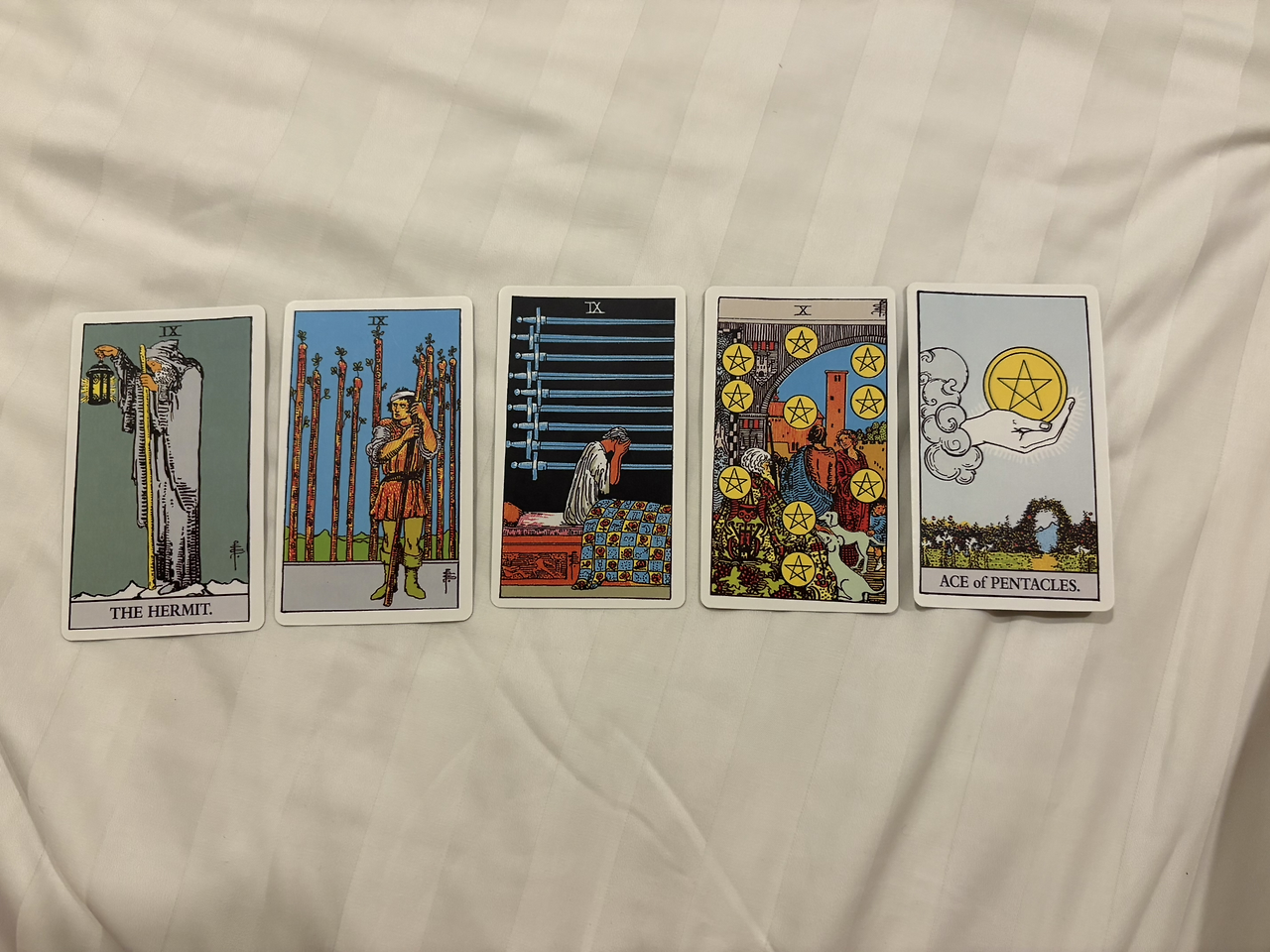 • 타로 카드 5장: 은둔자, 완드 9, 소드 9, 펜타클 10, 펜타클 에이스