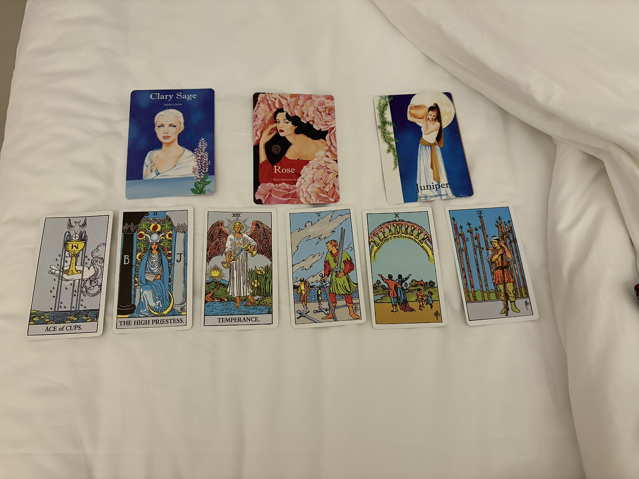 • 타로 카드 6장: 컵의 에이스, 컵의 10, 완드 5, 완드 9, 절제, 여사제