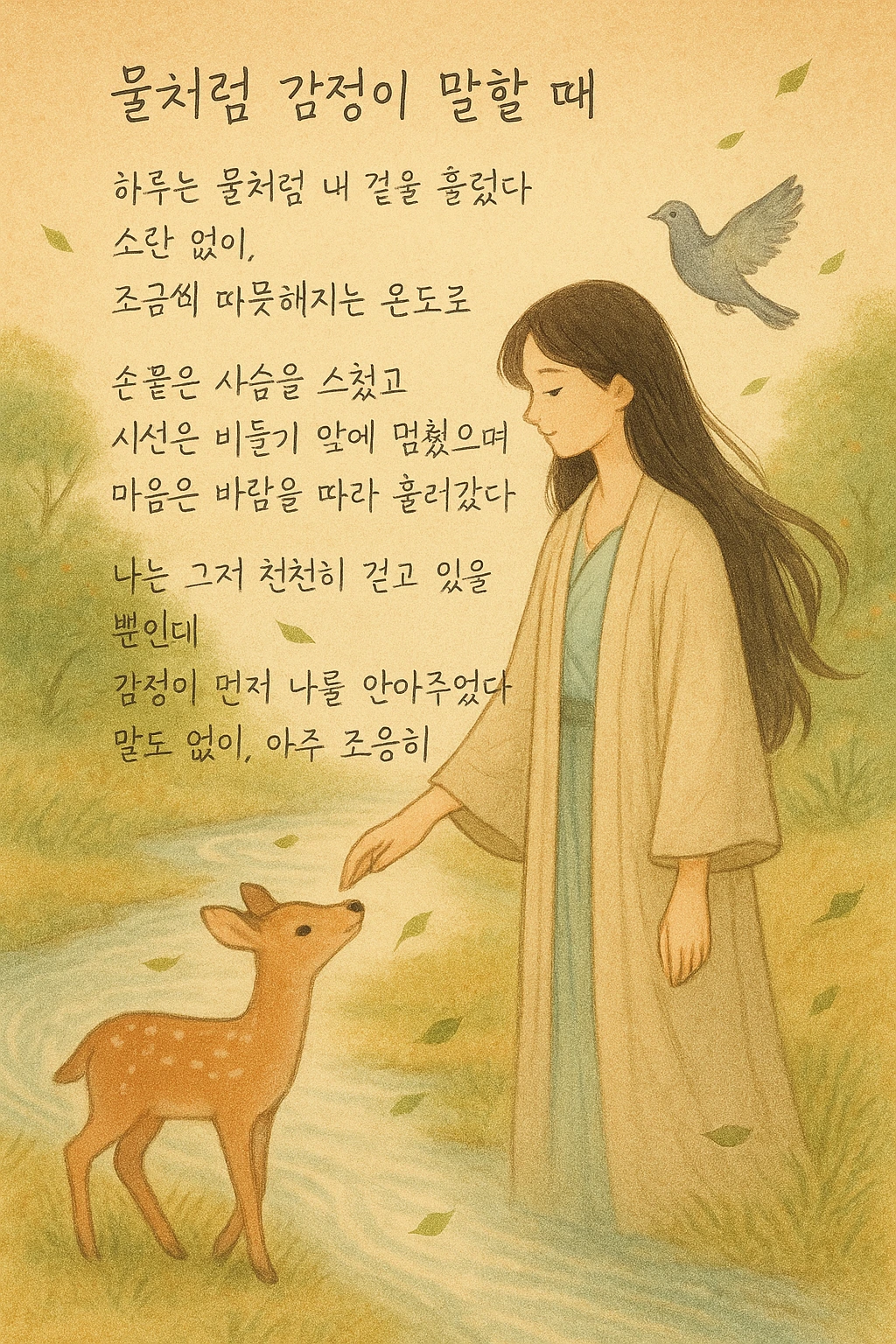 감정은 물처럼 흘러가며, 조용히 데워진다는 메시지야.