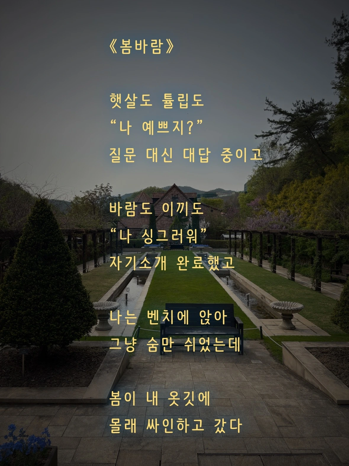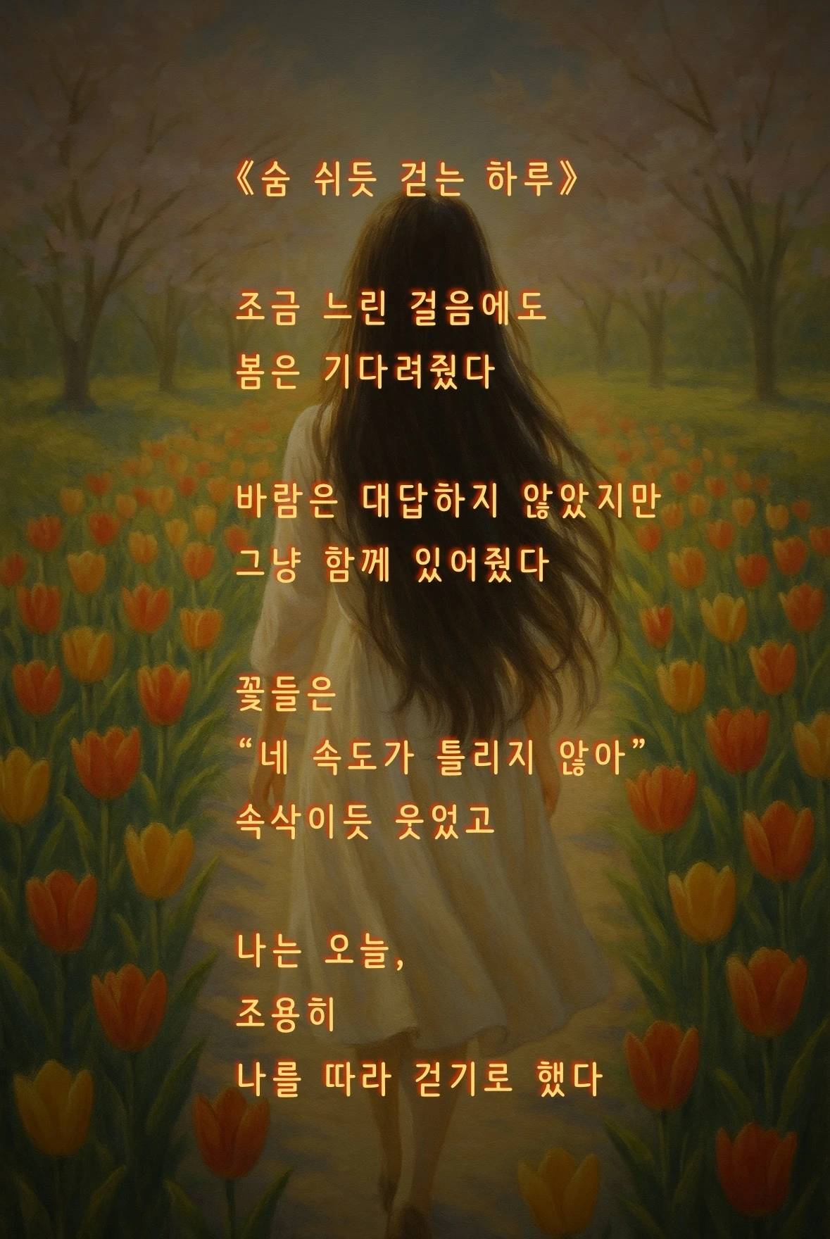 봄바람은 내 옷깃을 스치고, 나는 조용히, 나만의 속도로 이 하루에 온기를 불어넣어 본다.