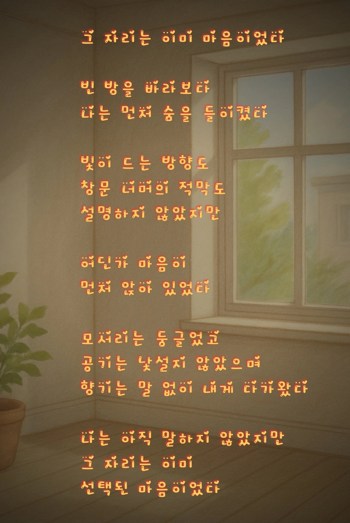 그저 조용히 창문 너머를 바라보다가, 손끝으로 벽지를 한번 쓸고 나서야 작은 숨을 내쉬었다.