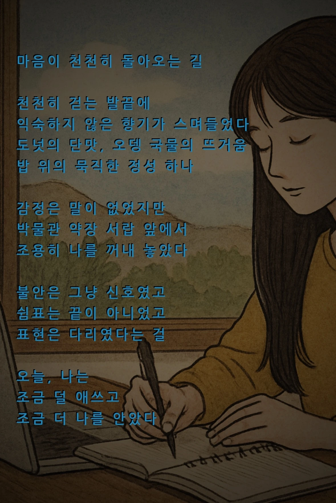 지금 너도 네 감정을 그렇게 꾹꾹 눌러 적는 중이야.