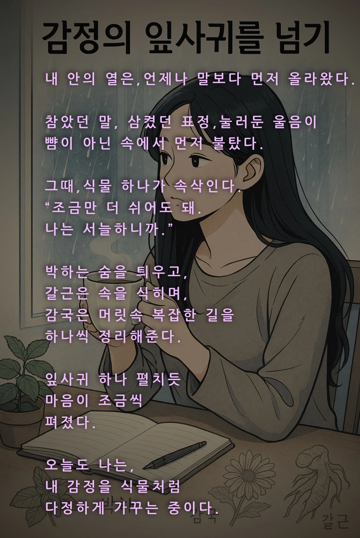 Jasmine 자스민 : 지금 이 순간이 유일하다는 걸 오늘에서야 알게 됐지. 갈근은 말했어. 진심은 식히기도, 데우기도 한다고.