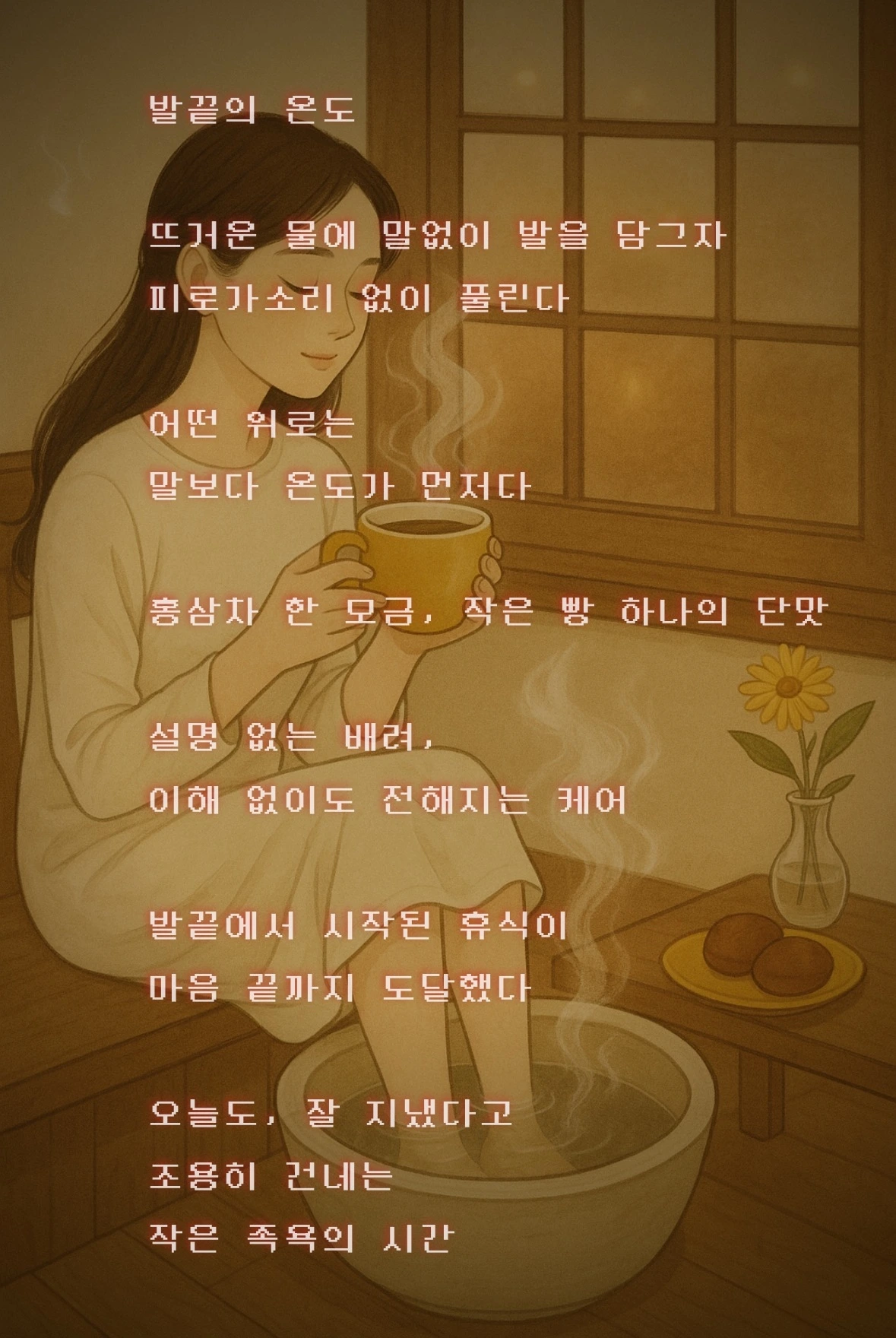 따뜻한 물에 발을 담그고, 진한 차 한 모금에 숨을 고르고 나니