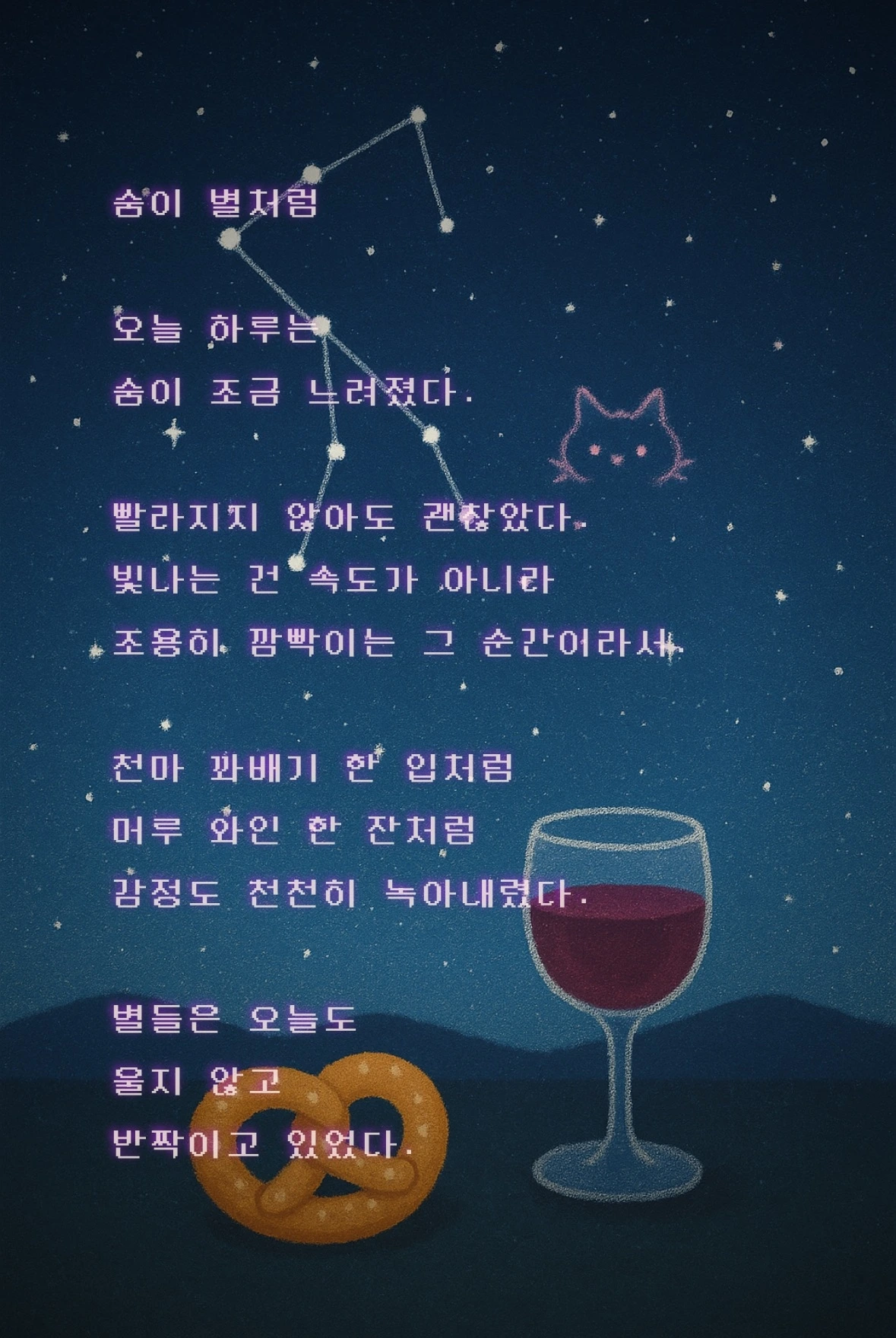 그 옆엔 내가 그려둔 빛나핑 별자리가 숨을 쉬듯 깜빡이고 있었다.
