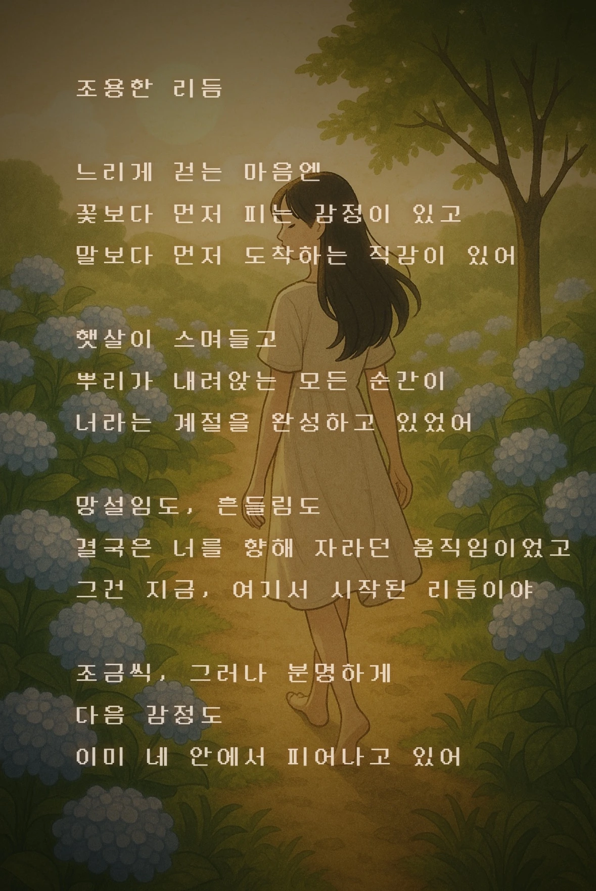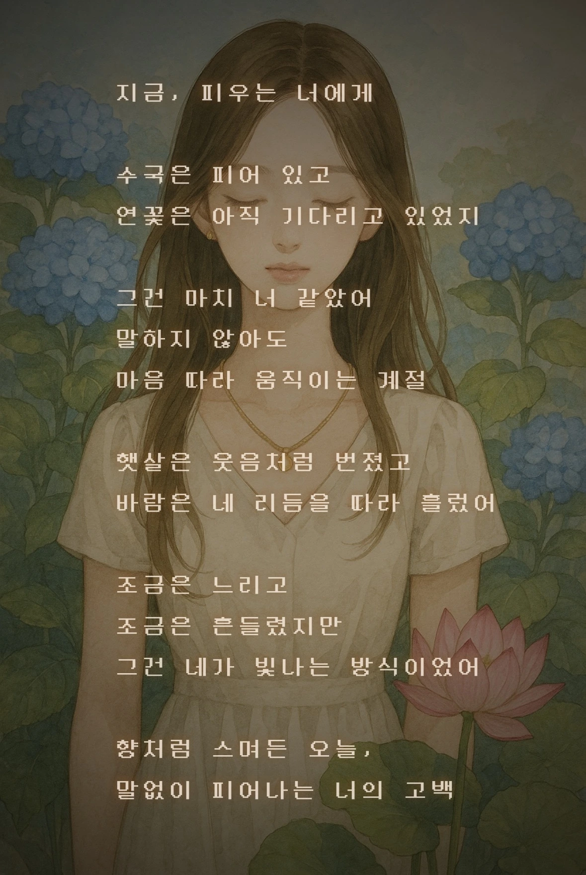 Juniper (주니퍼): 연꽃은 아직 봉오리였지만, 수국은 너의 리듬에 맞춰 피어나 있었어.