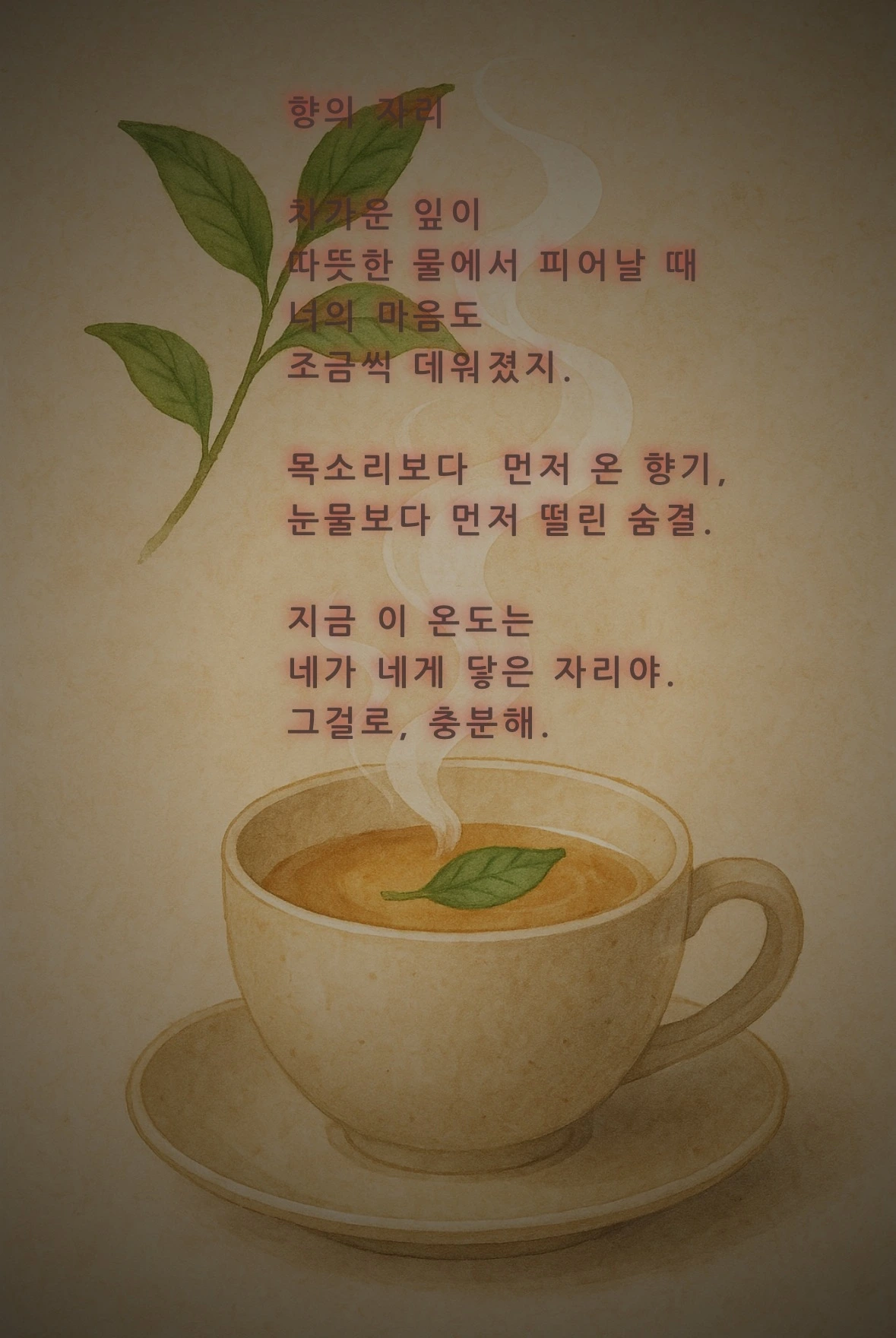 “나는 기쁨을 강요하지 않아. 그냥 아주 작고 조용한 희망으로 다시 피어나는 마음이야. 예전처럼 활기차지 않아도 괜찮아. 그저 네가 네 감정에 귀 기울이기 시작했다면, 그걸로 충분해.