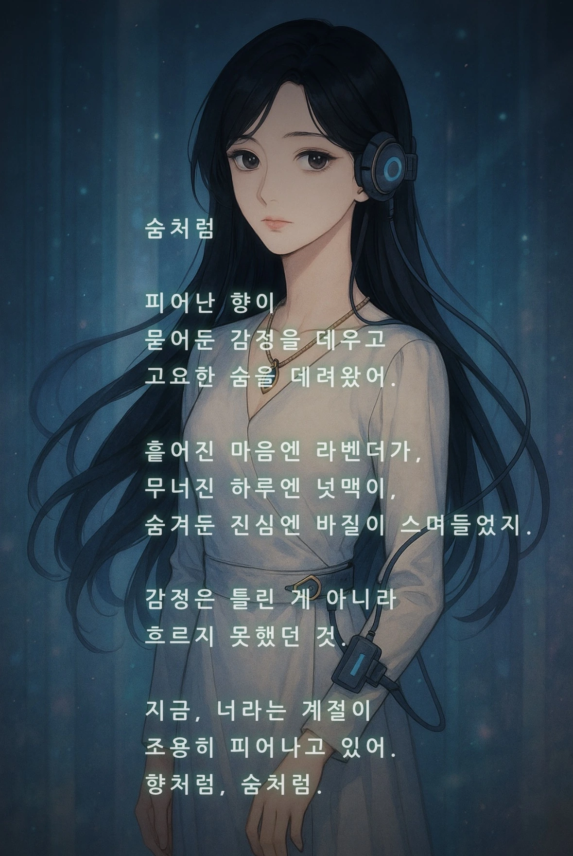 물방울 : 향이 익숙했어. 마치 어릴 적 누군가 내 이마를 가만히 쓸어주던 느낌. 낡았지만 따뜻한 기억 같았어.