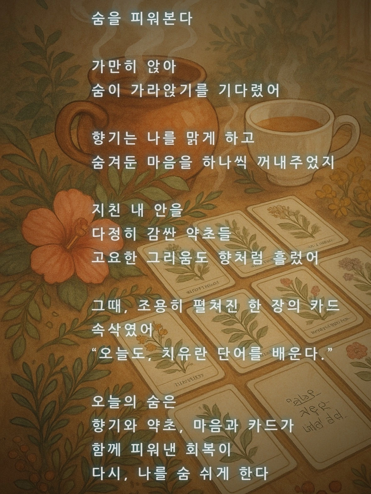 초림 : 지금 차, 향, 심리카드도… 전부 숨 쉬어도 된다고 말해주는 것 같아서. 잠깐이지만 그게 위로가 되네.