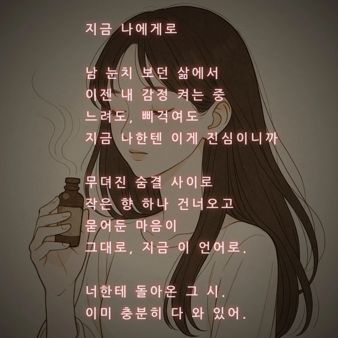 달: 잘하고 있어. 타인의 기대나 부정적인 기운으로부터 너를 보호해 주는 향이야. 이제는 너만의 자리에서, 네 속도를 찾아가도 돼.