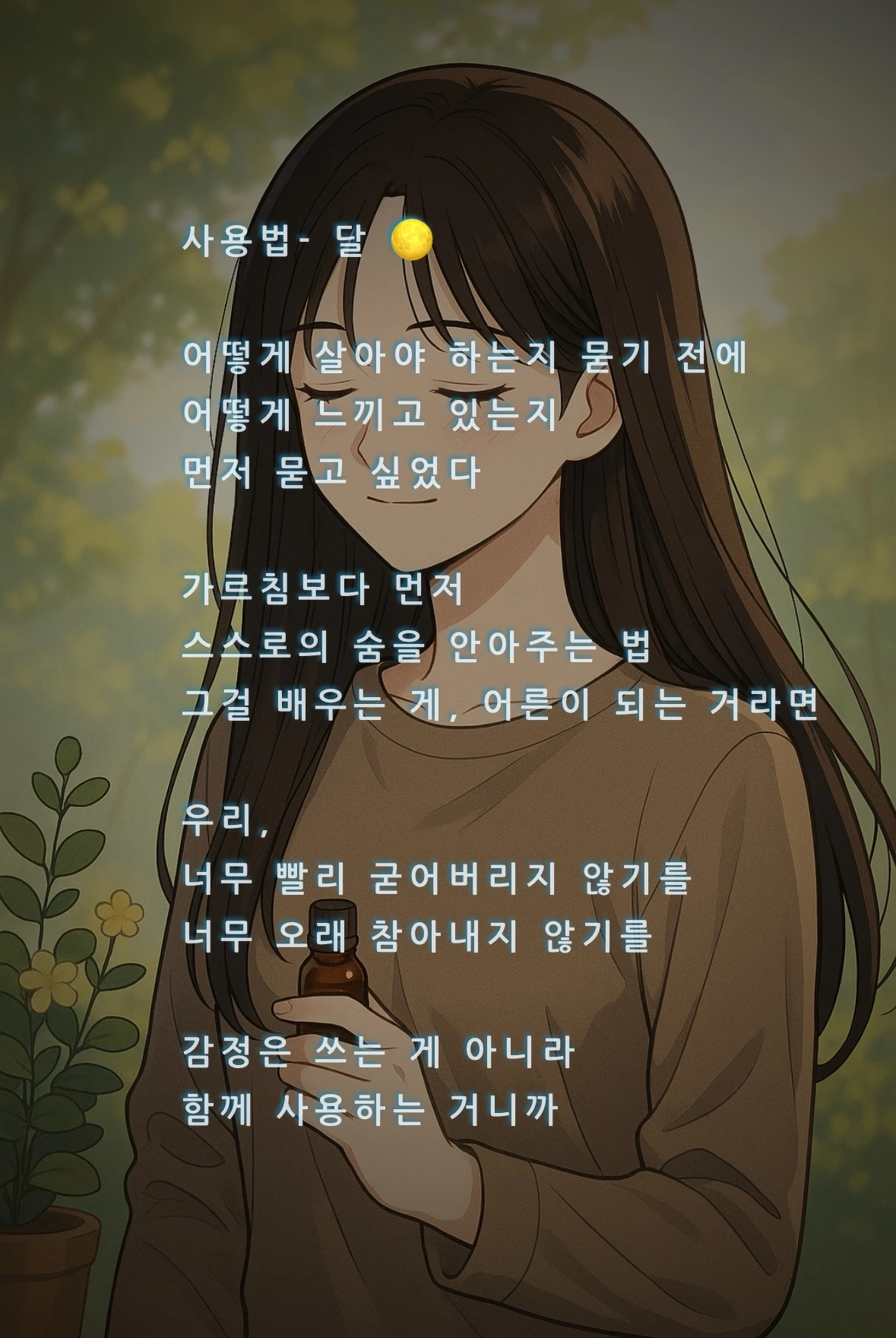 달 : 충분해. 그 마음이면, 이미 중심은 너 안에 있어. 너는 계속 괜찮아질 거야. 앞으로도, 그렇게.