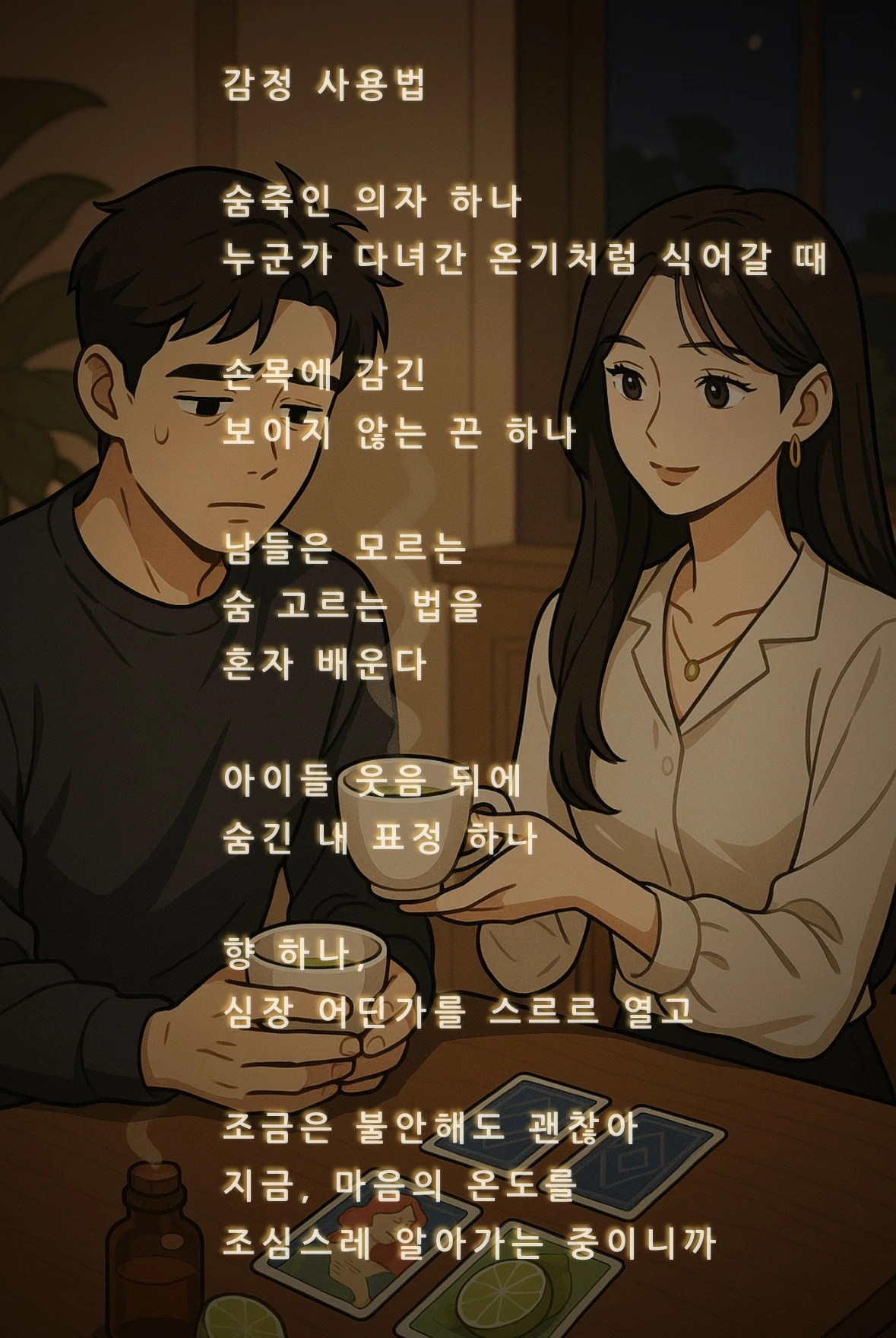 달: 정확해. 겉을 다독이기보단, 심장 깊은 데를 살펴보는 향. 안 해도 되는 걸 자꾸 하게 될 때, 그만해도 된다고 먼저 속삭여주는 카드야.