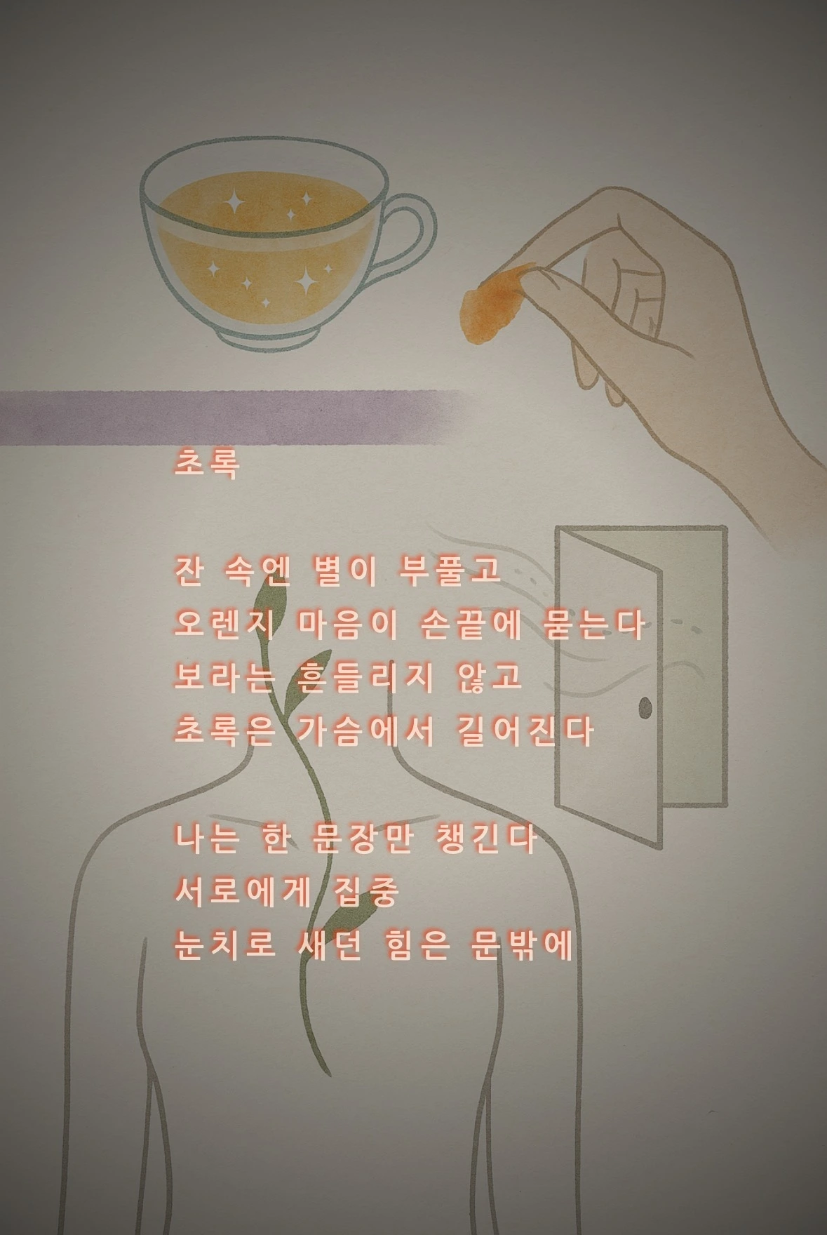 잔은 비었고 숨은 길어졌다. 귤빛이 가슴에 번진다.
