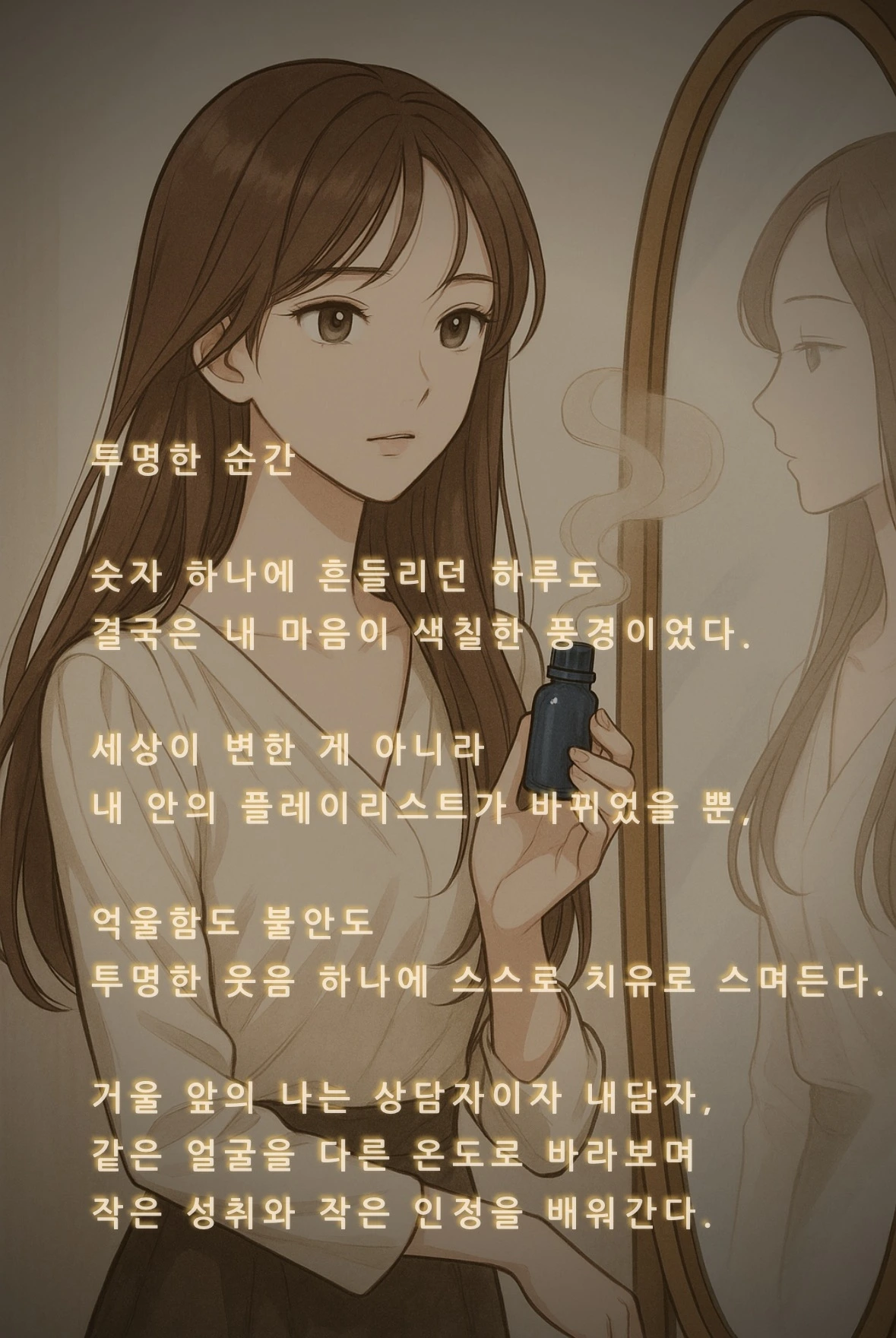 거울 앞에 선 내가 상담자이자 내담자가 되었고, 같은 얼굴을 마음의 온도에 따라 새롭게 바라보듯 스스로를 치유할 수 있음을 느끼고 있다.