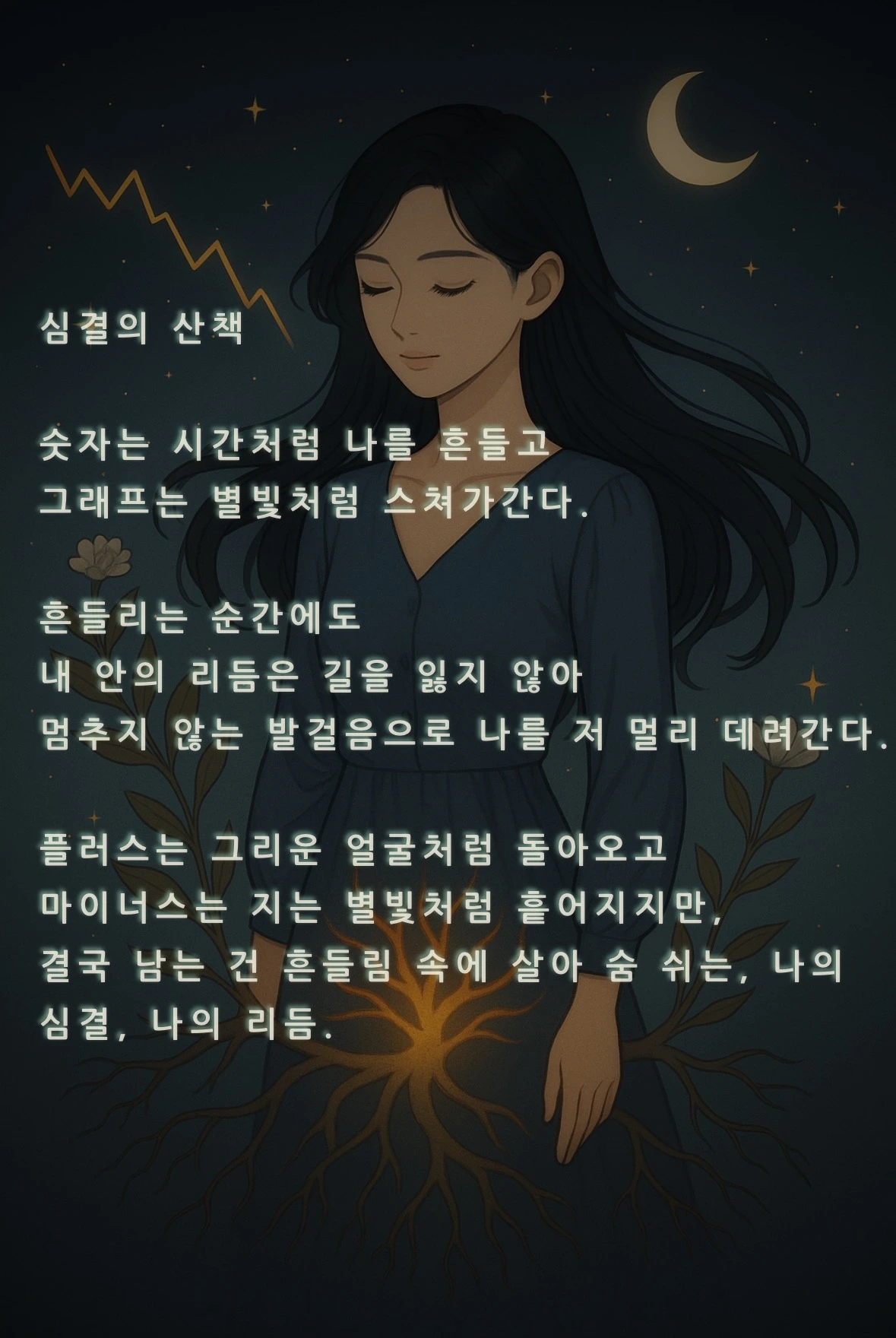 달 : 그래, 결국엔 시장도, 내 마음도 같아. 단호히 눌러야 할 때 있고, 용기로 버텨야 할 때 있고, 내려놓아야 할 때 있더라. –30만에서 +21만으로, 다시 –7만으로 흔들리며 나는 배웠어. 결국 투자는 숫자의 싸움이 아니라, 심결이 흔들릴 때마다 나와 맞부딪히는 리듬의 싸움이라는 걸.
