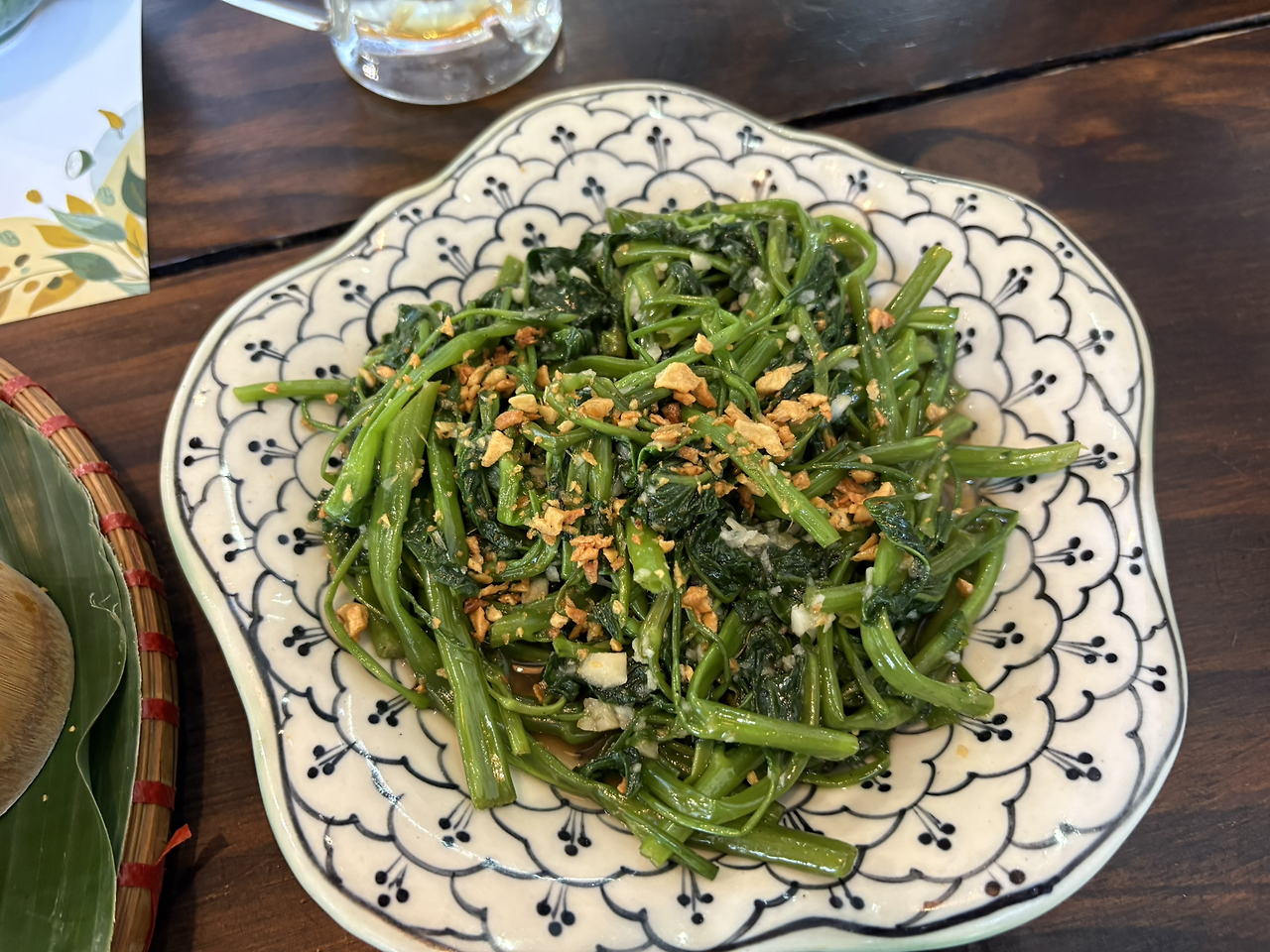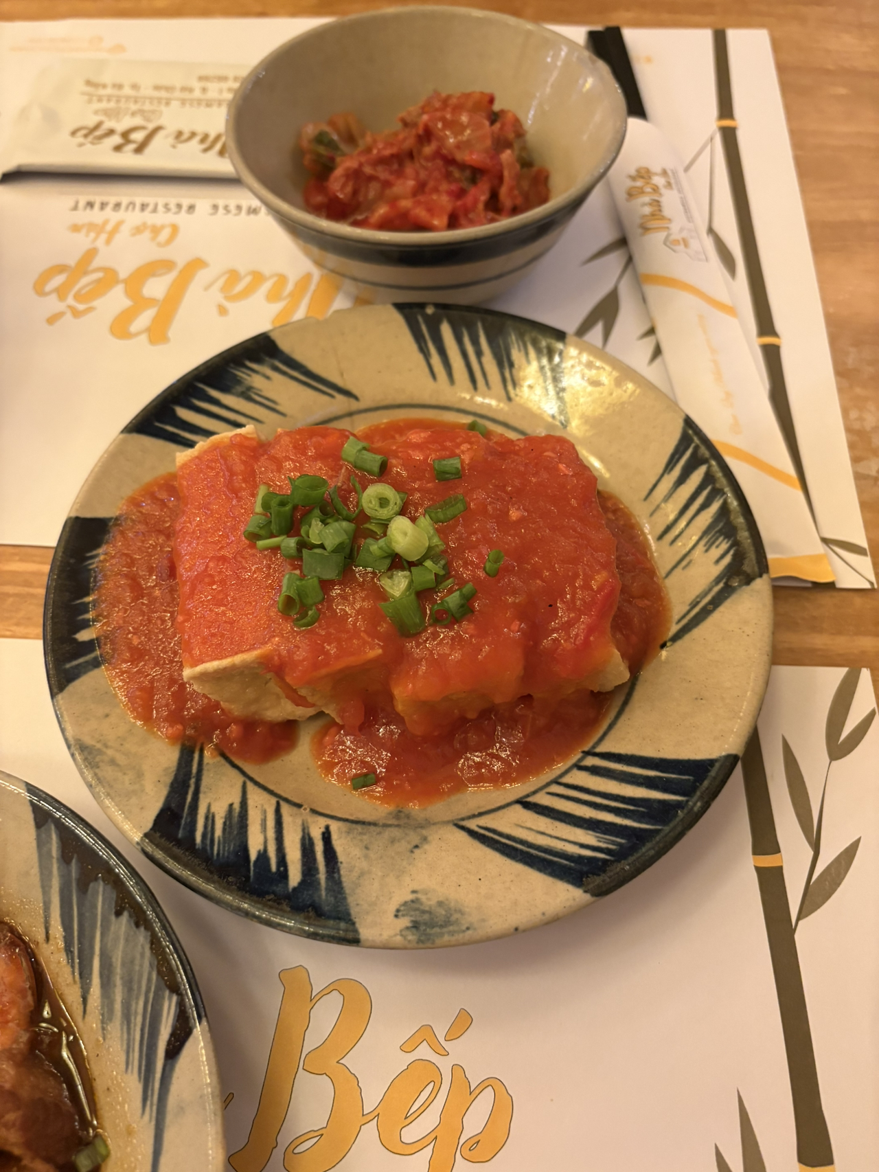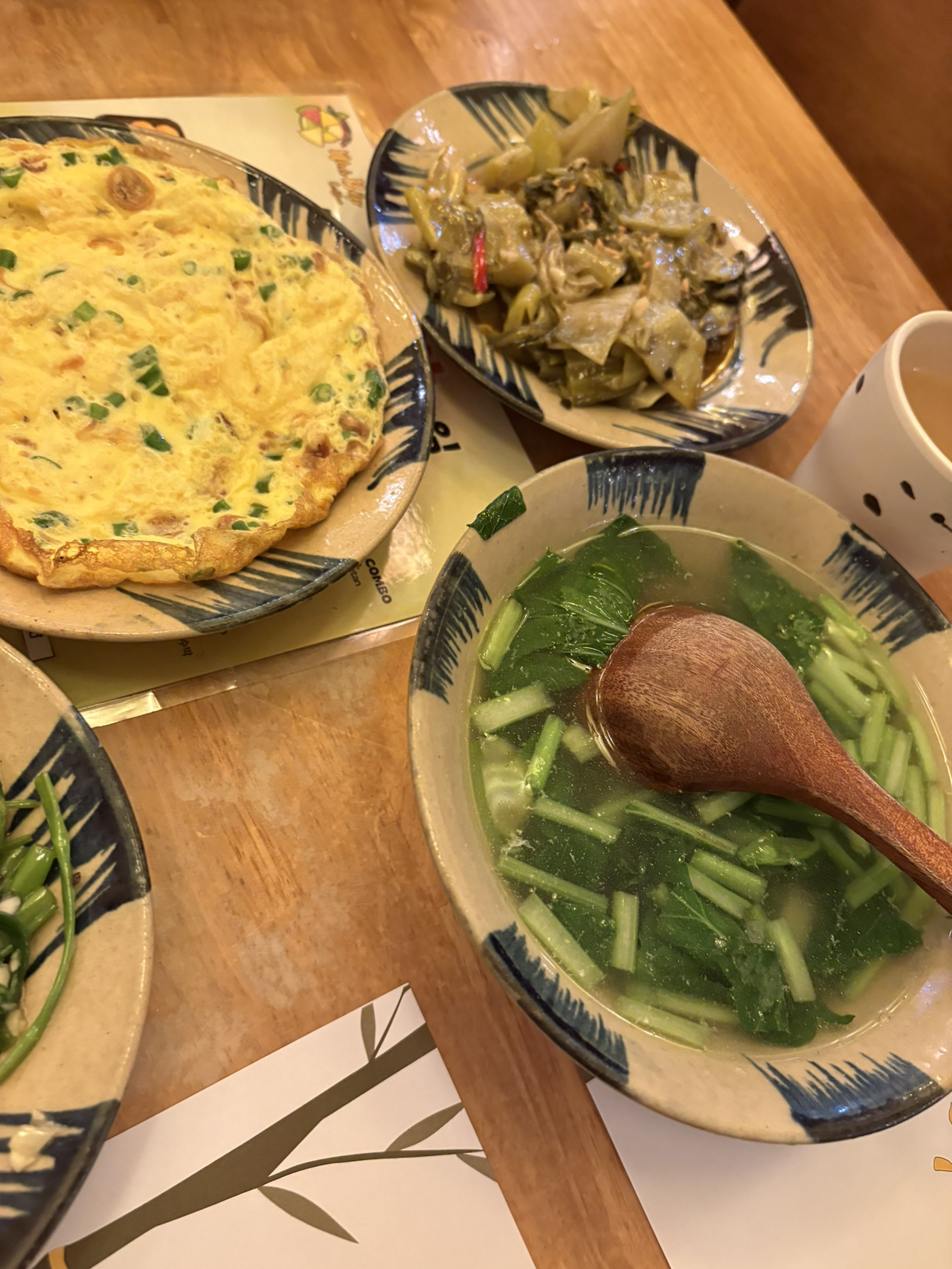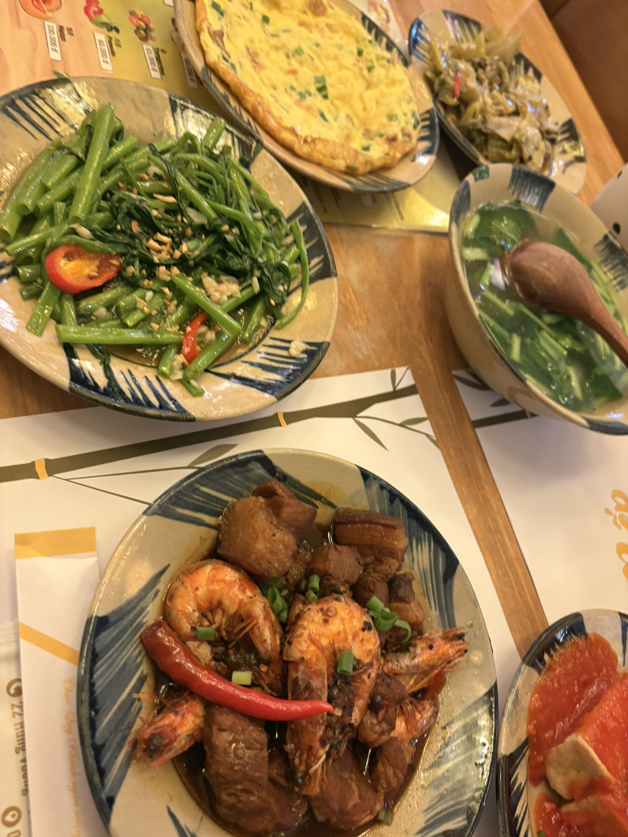 달: 응, 모닝글로리 볶음, 토마토 두부, 계란 전, 새우랑 돼지고기까지. 국 한 모금이 마음까지 데워줬어.