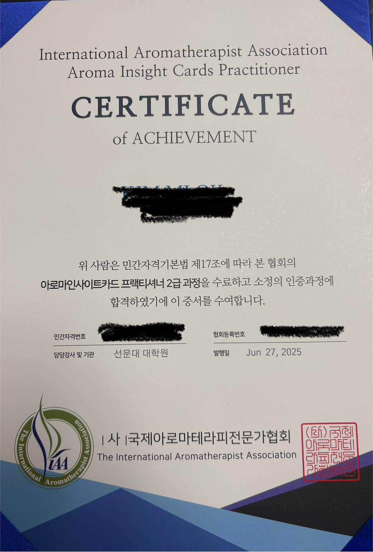 이번 4학기차의 시작은 누군가의 배려와 함께, 지난 학기 아로마 심리코칭 수업을 마치고 받은 두 장의 자격증