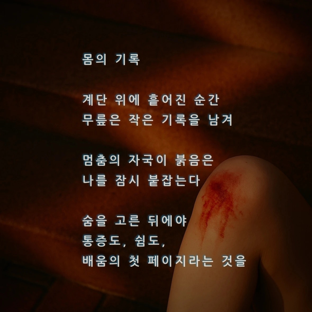 눈을 감고 머무는 순간, 통증마저 새로운 배움의 배경이 되어, 입술로 다 꺼내지 못한 자기소개는 아쉬움으로 남았다.