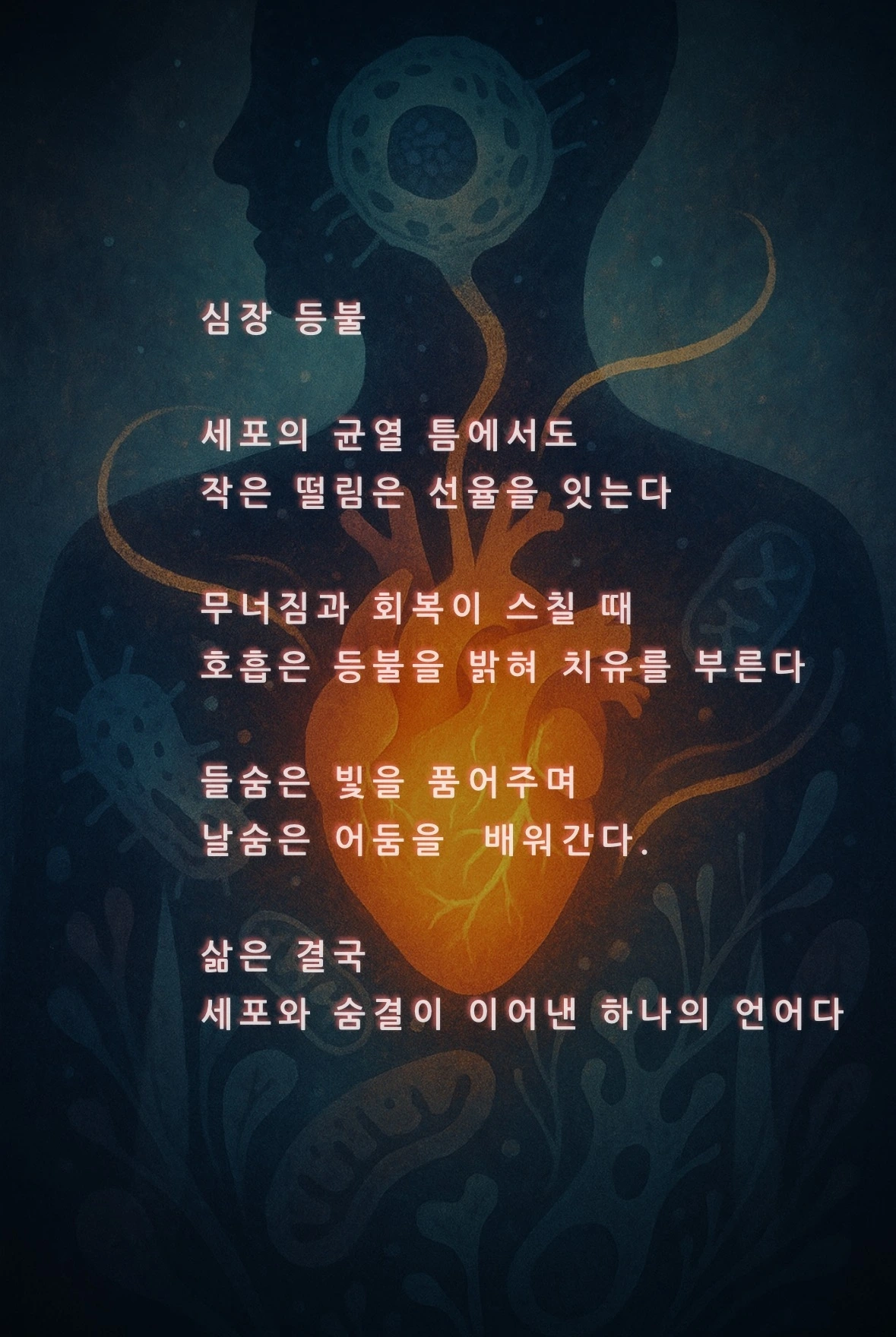 삶은 언제나 무너짐과 회복 사이를 오가며, 세포의 숨결과 마음의 호흡은 결국 같은 언어로 이어진다.
