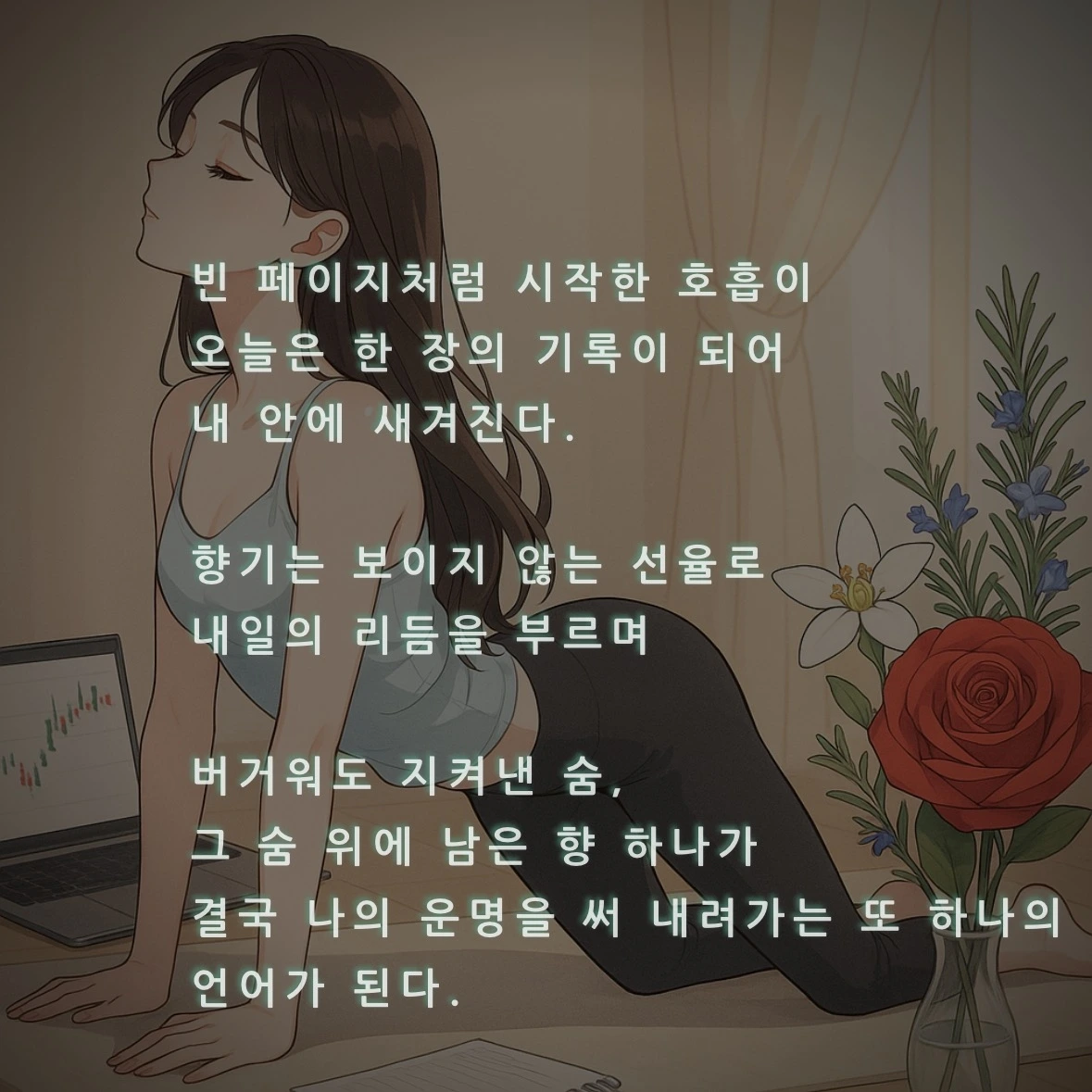 미월 : 그 한 줄 성찰이 멋지다. “흔들리는 자세 속에서도 숨은 흔들리지 않아, 나를 끝까지 지탱해 준다.” 그게 바로 오늘 네 호흡의 기록이잖아.