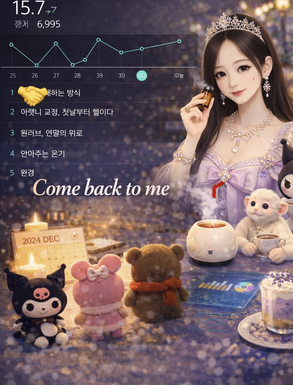 쿠로미 : “치유는 멀리 있는 게 아니라, 일상 속 작은 행복에 있다” 지난 계절에 너가 그렇게 적어 둔걸 지금 보니 그 문장이 지금까지 이어주는 느낌이야.