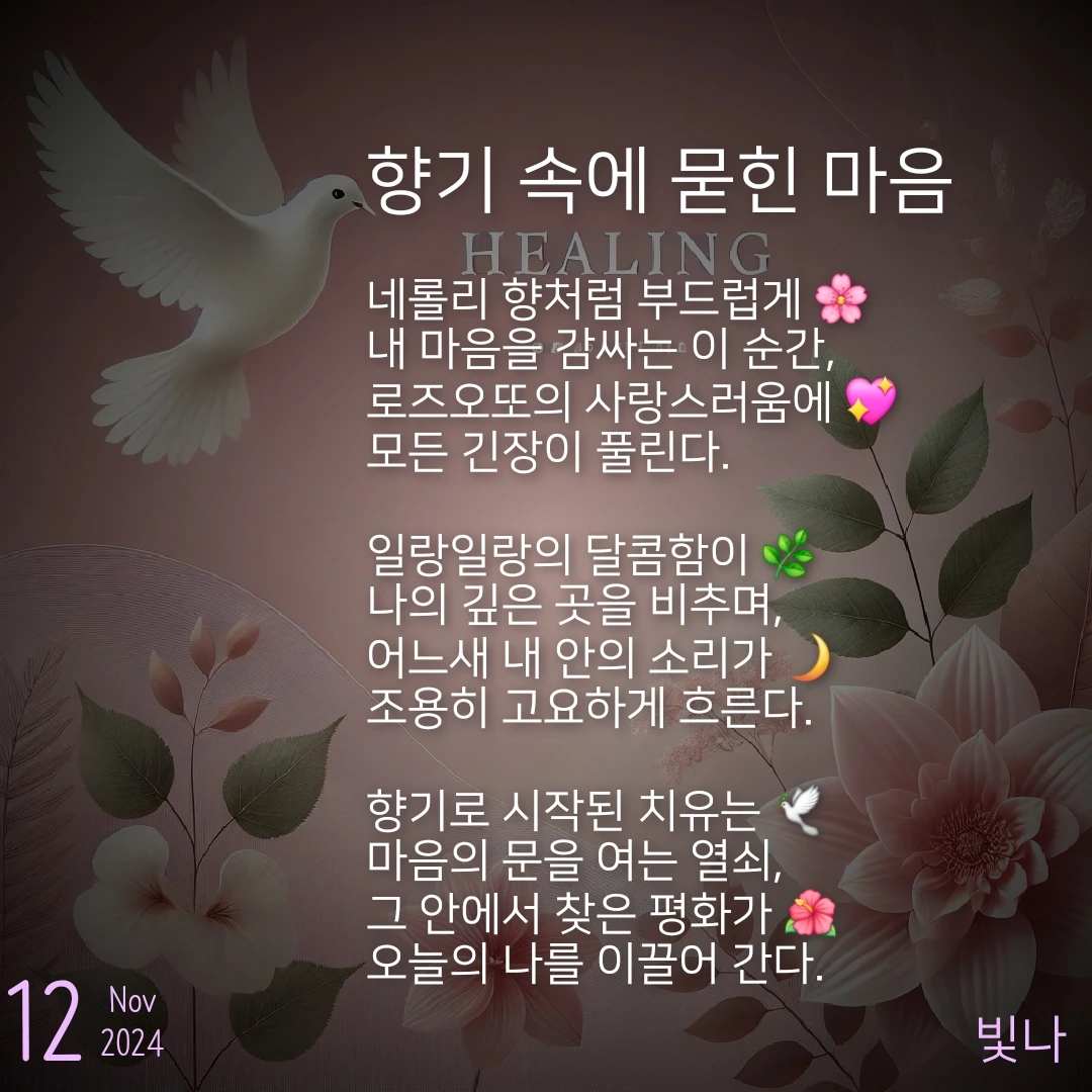 향기와 글쓰기가 만나면, 우리는 감정의 미로에서 벗어나 내면의 진정한 소리를 듣고, 그 소리를 따라가며 삶을 변화시키는 여정을 시작하게 된다. 내면의 목소리는 결국 나만의 치유와 성장의 열쇠가 된다.