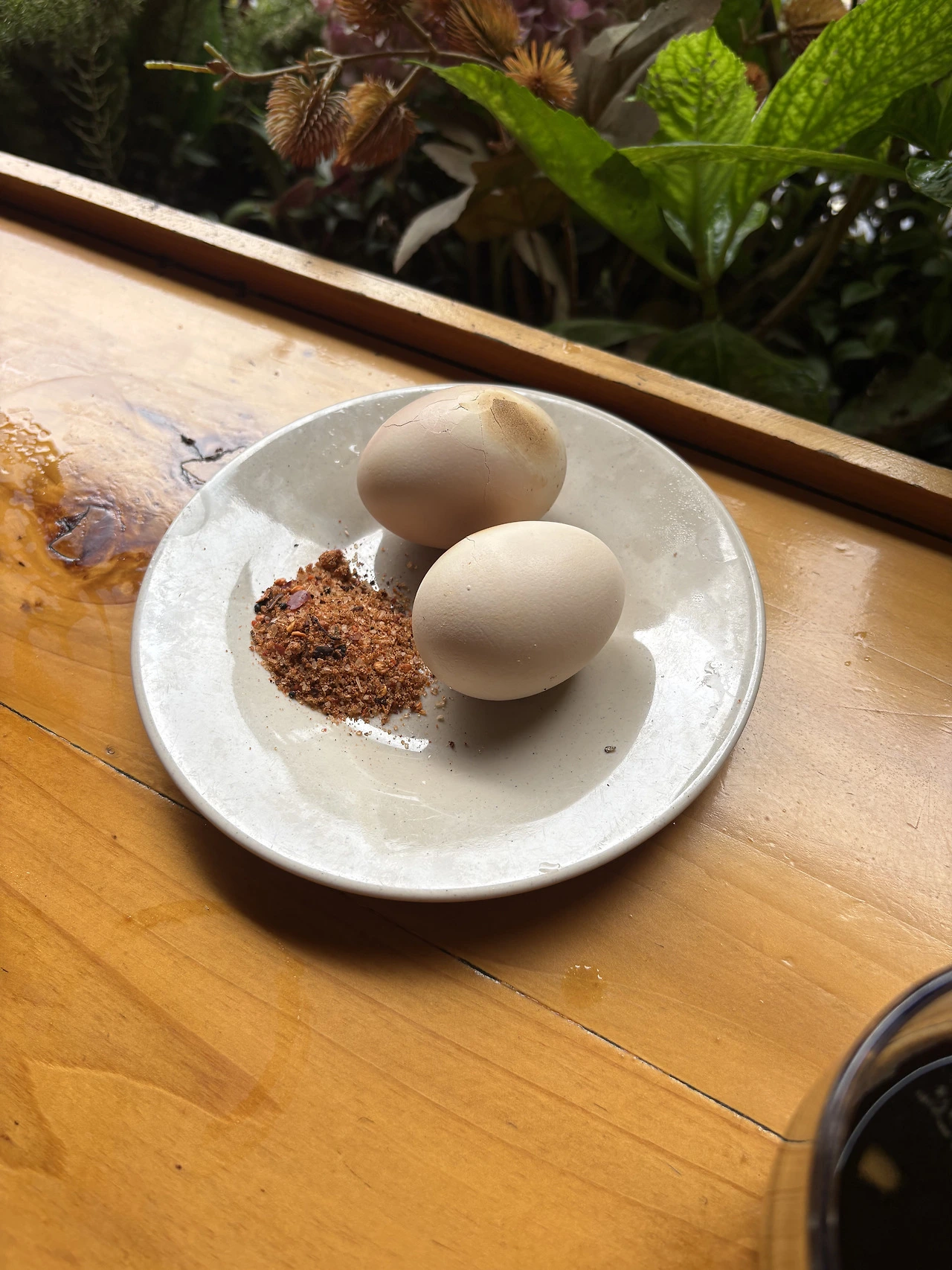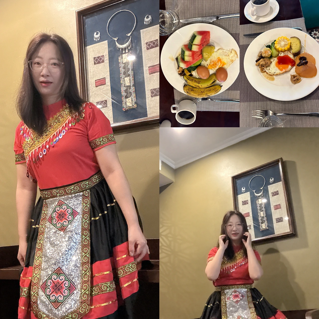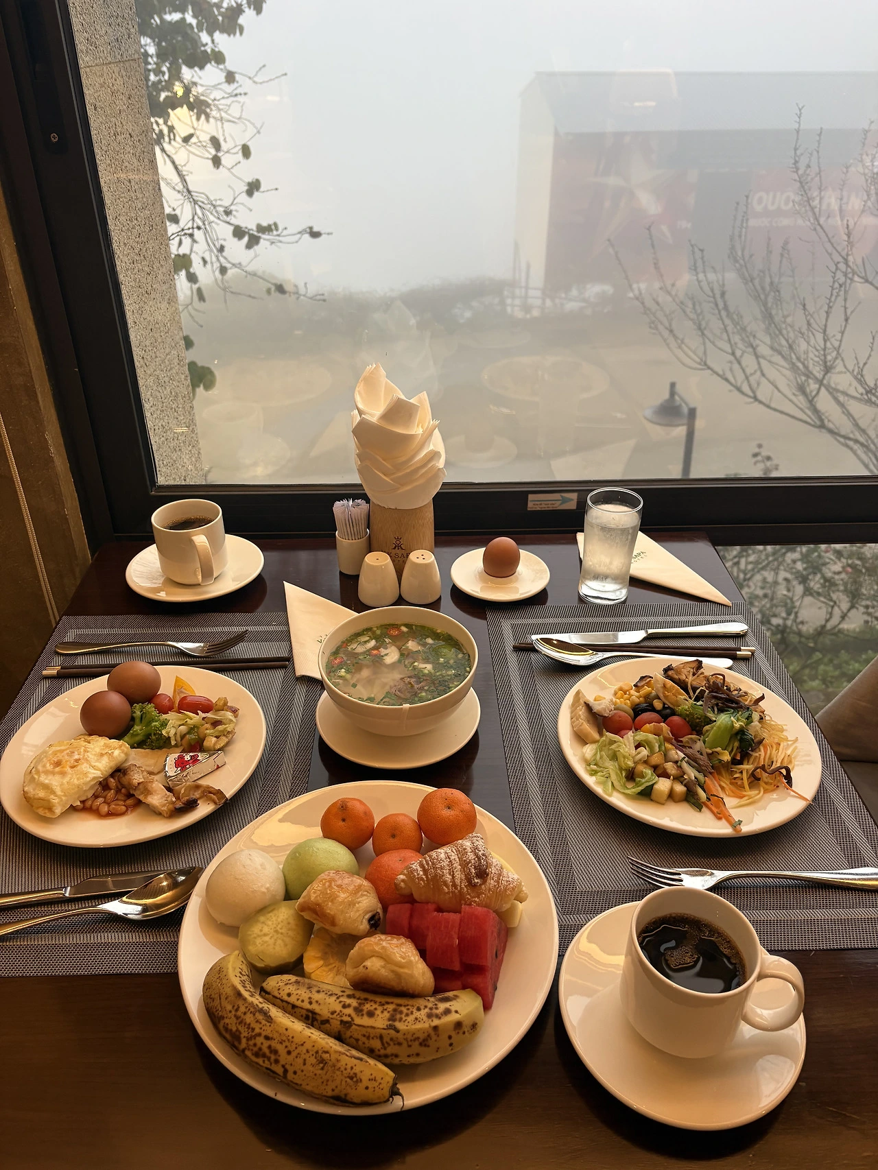 하츄핑 : 아침이 되자 다시 다른 온도가 시작, 창밖의 안개와 조식 테이블의 색감이 동시에 눈을 깨워줘.