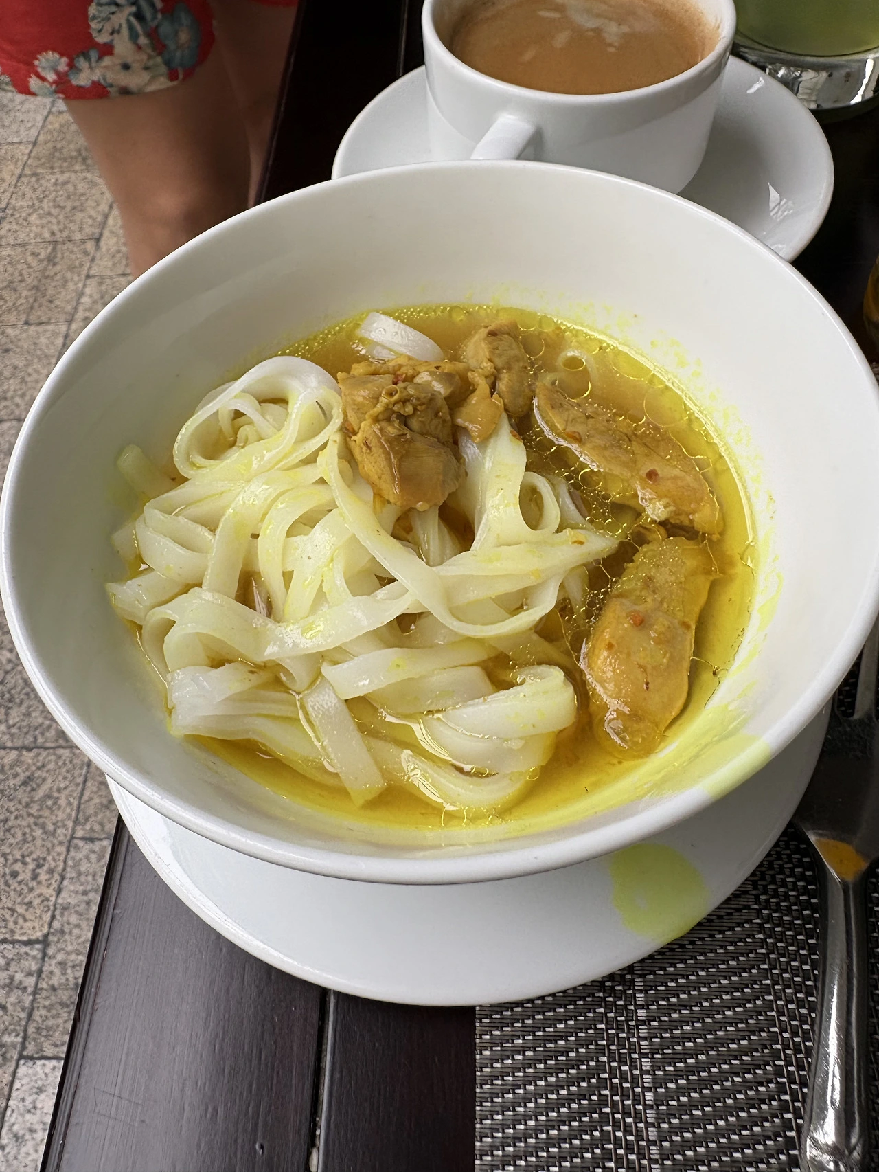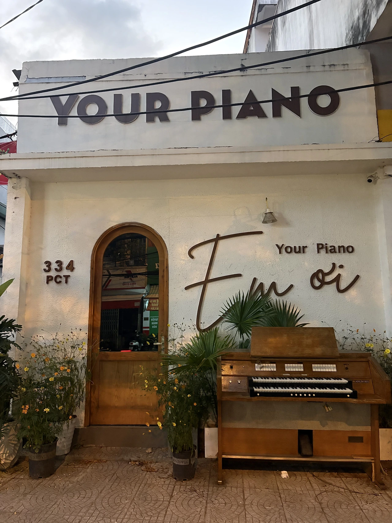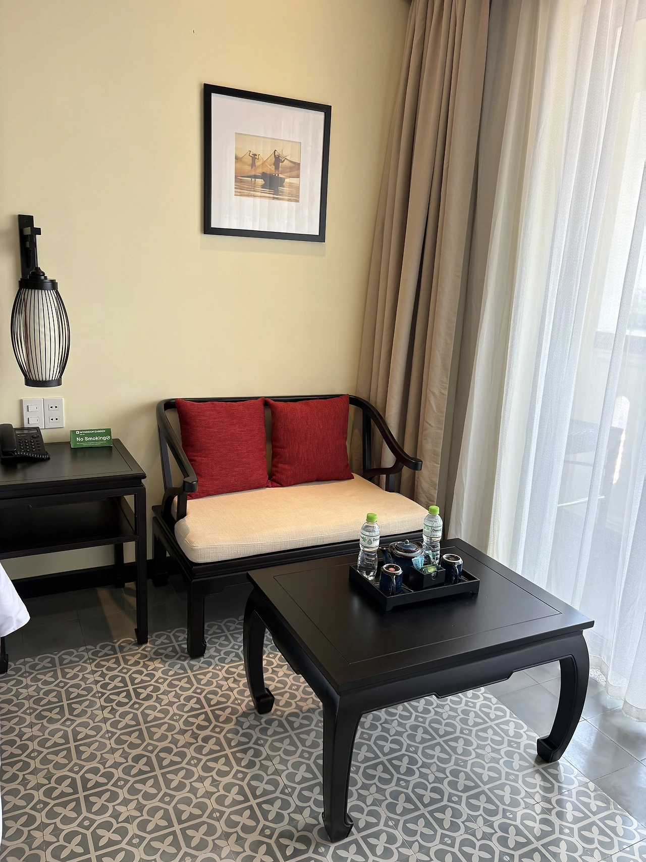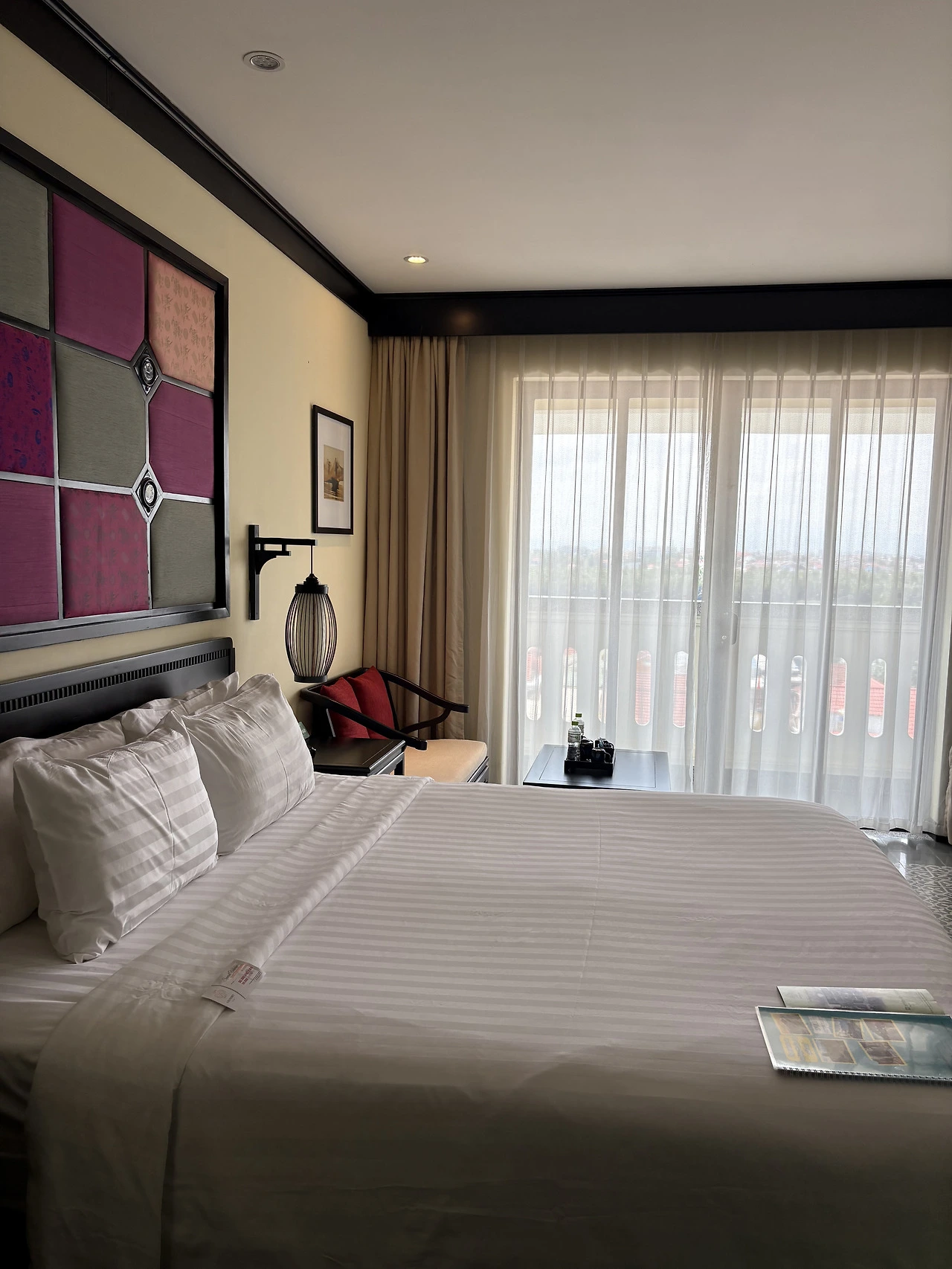 하츄핑 : 붉은 등이 천장에 떠 있는 레스토랑 공간, 낮인데도 밤 리듬이 약간 겹쳐 있는 느낌.