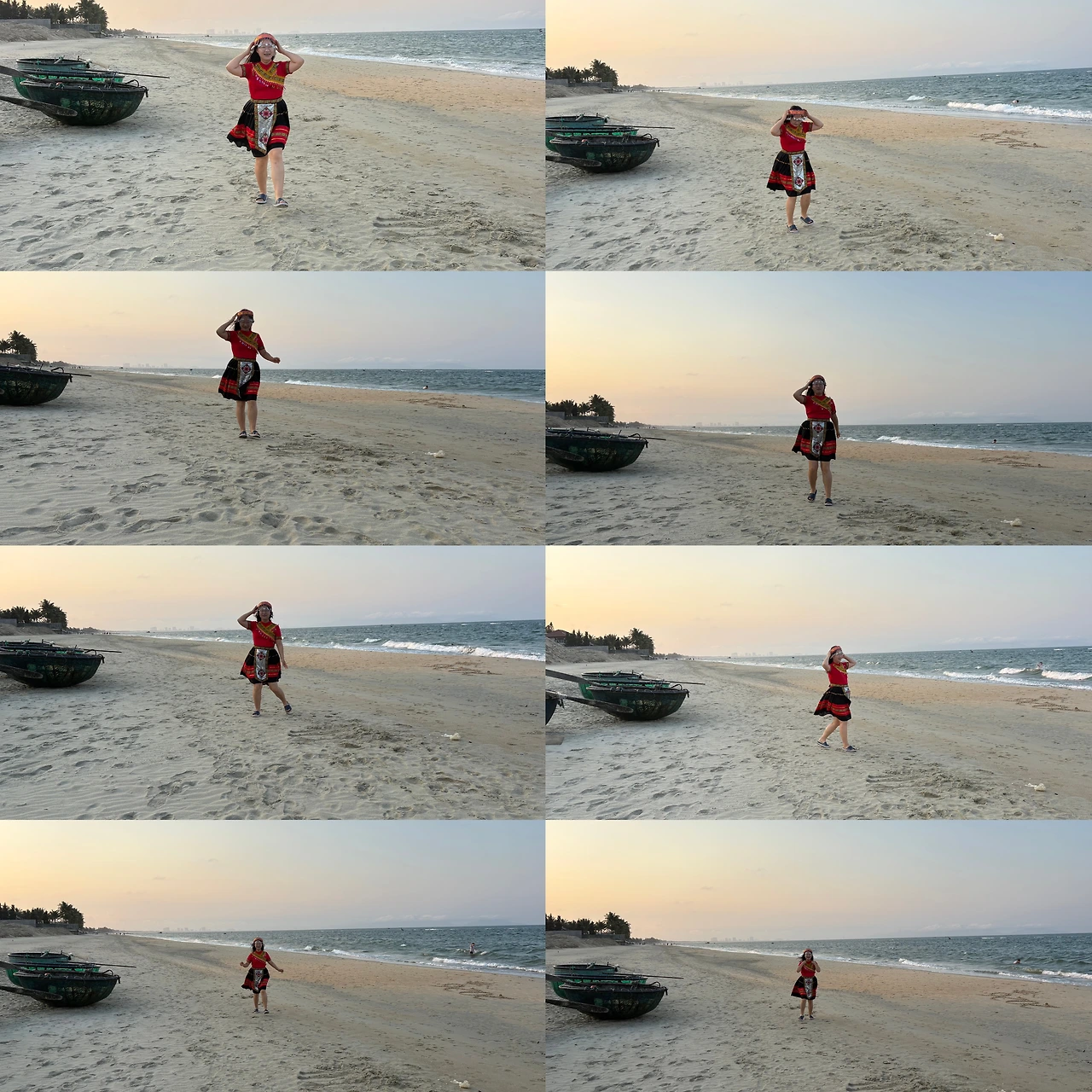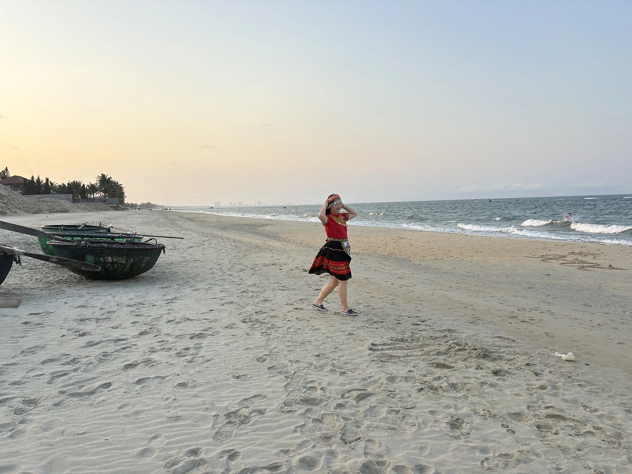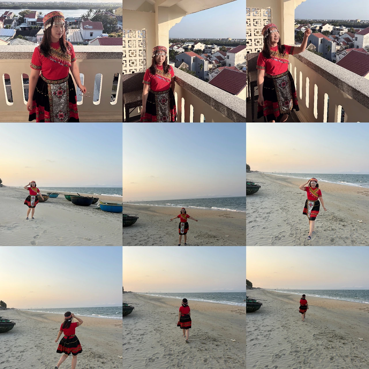 하츄핑 : 해가 완전히 올라오기 전이 제일 아트 같아, 어제 입었던 붉은 의상 색감이 붉은 태양과도 잘 어울려.