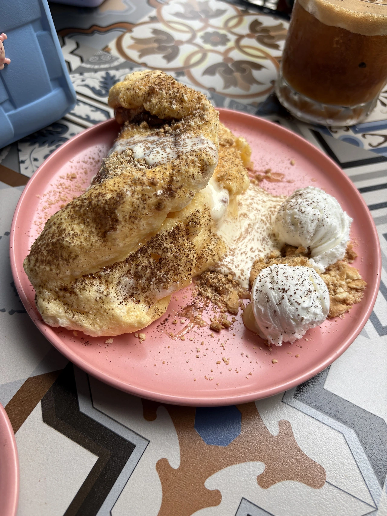 하츄핑 : 녹아내리는 크림이 시간처럼 보여서 천천히 먹어줘야 할 것 같은, 체크인은 숙소에서 시작, 하루는 카페에서 다시 믹싱 되는 중.