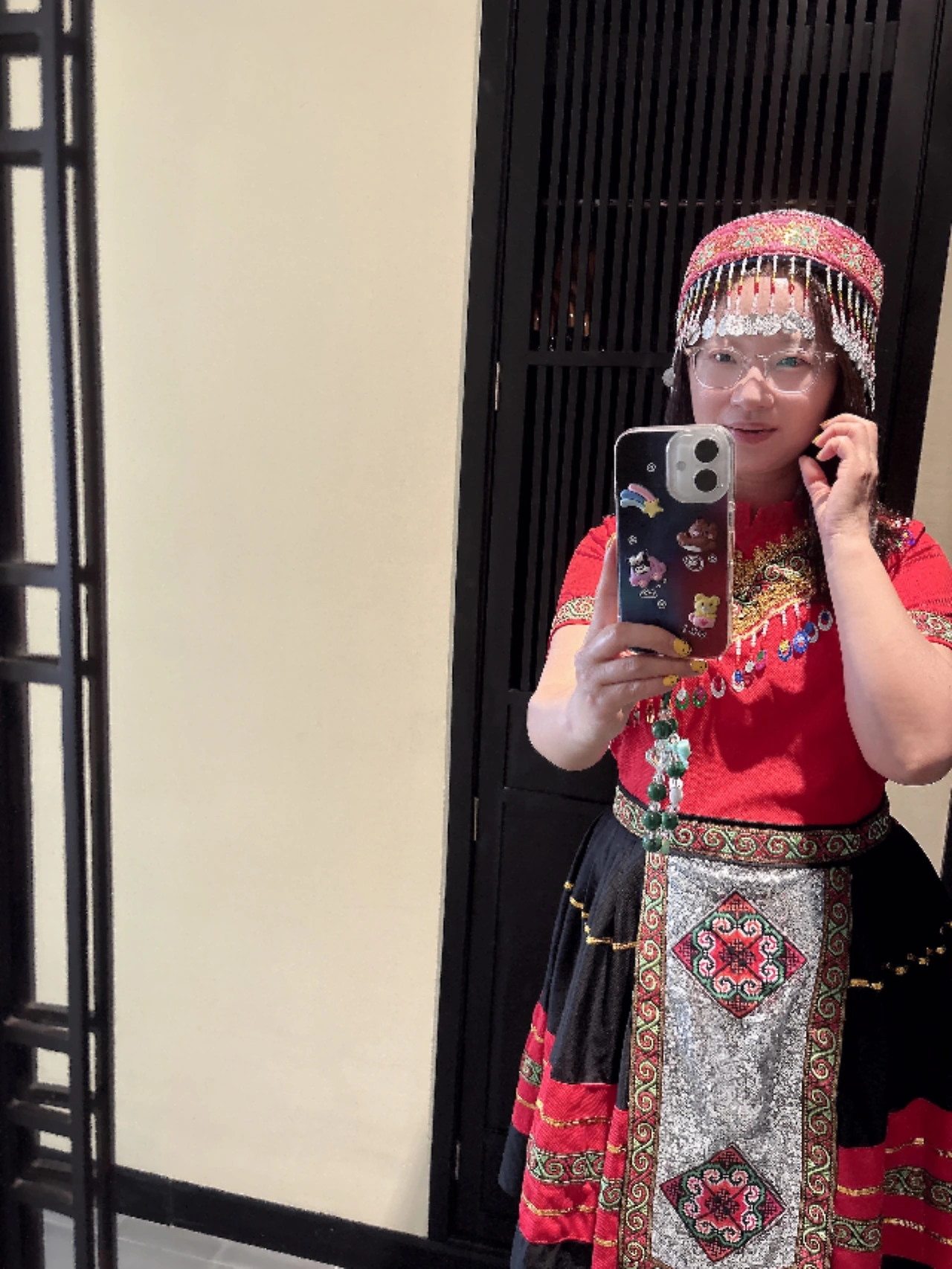 라부부 : 흐몽족 의상을 입은 채 거울 앞에 서 있는 순간, 붉은 색감이 공간 온도랑 맞물리니까