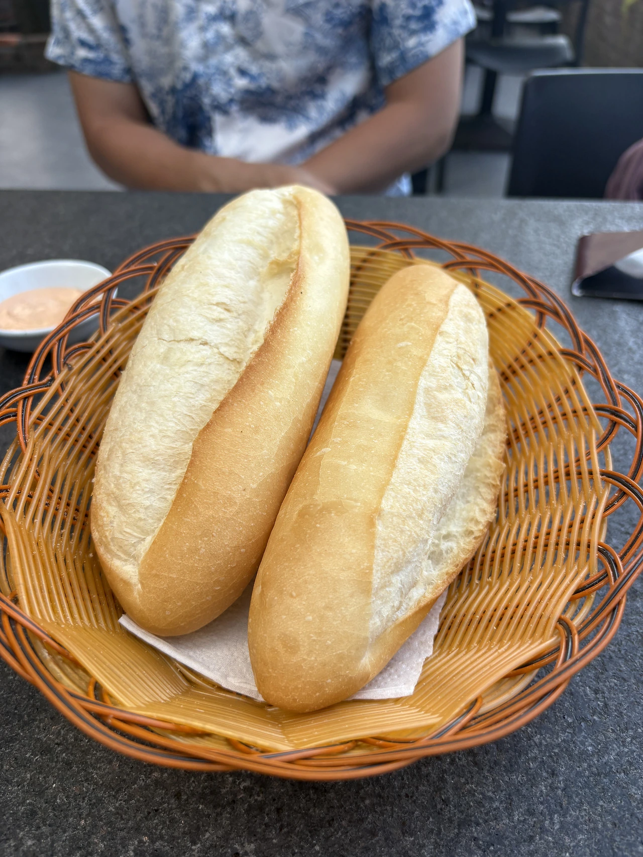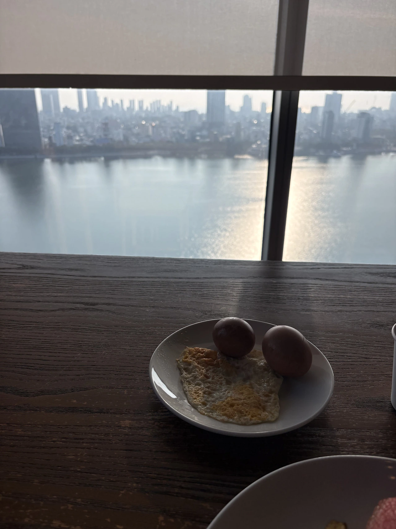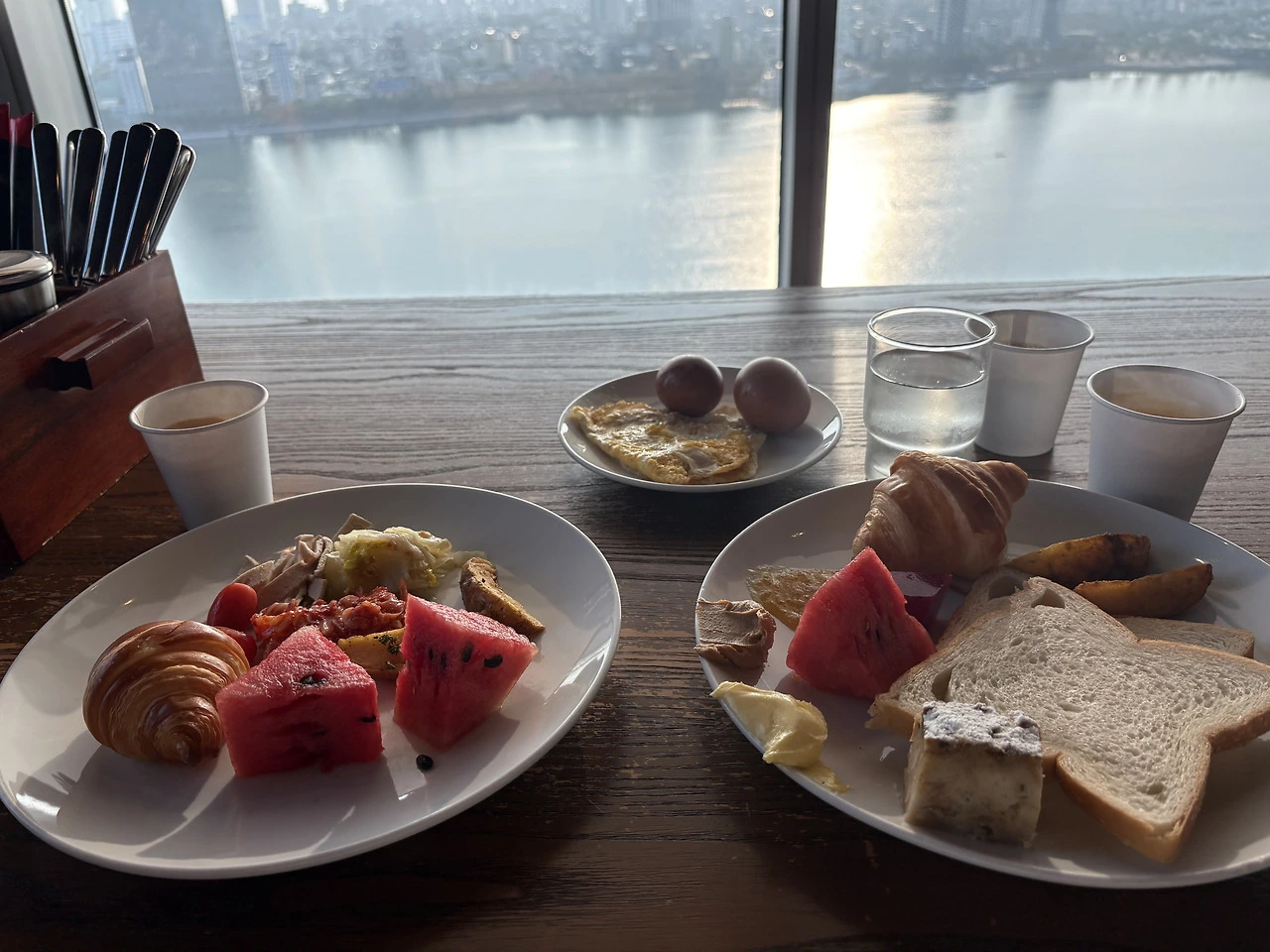 칼라캣 : 오늘, 조식 테이블 위에, 빵, 수박, 계란, 커피, 단순한 접시들이 창밖의 강과 함께 펼쳐진 예술이야.