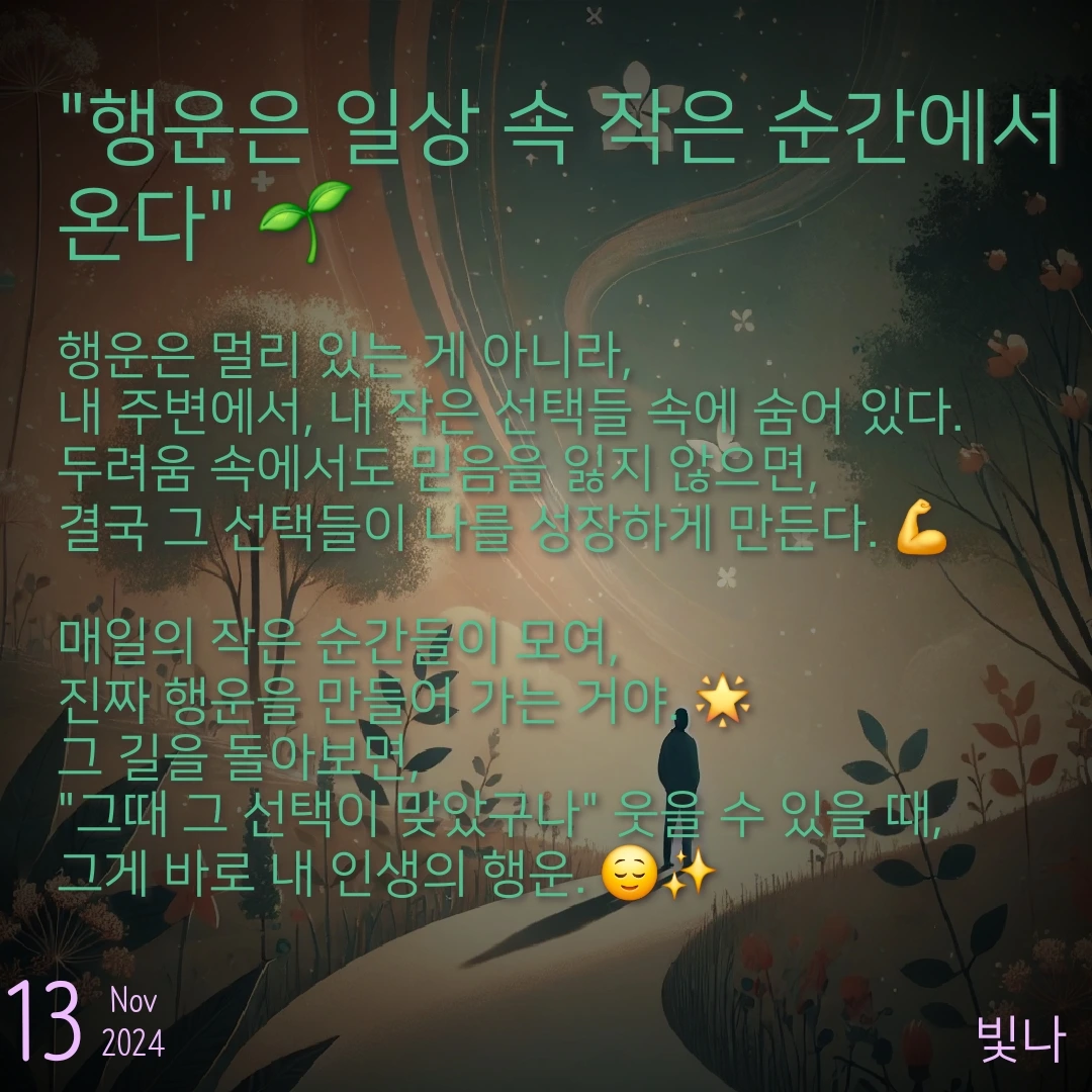 이런 경험들이 나를 조금 더 따뜻한 시선으로 세상을 바라보게 만들었다. 결국 행운이란 거창한 일이 아니고, 작은 선택과 신뢰에서 오는 것이었다는 걸 알게 되었다. 그 작은 일들이 모여 나에게 큰 행운을 가져다줄 거라 믿으며, 지금도 그 믿음으로 하나씩 나아가고 있다.