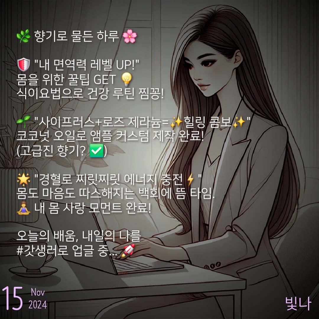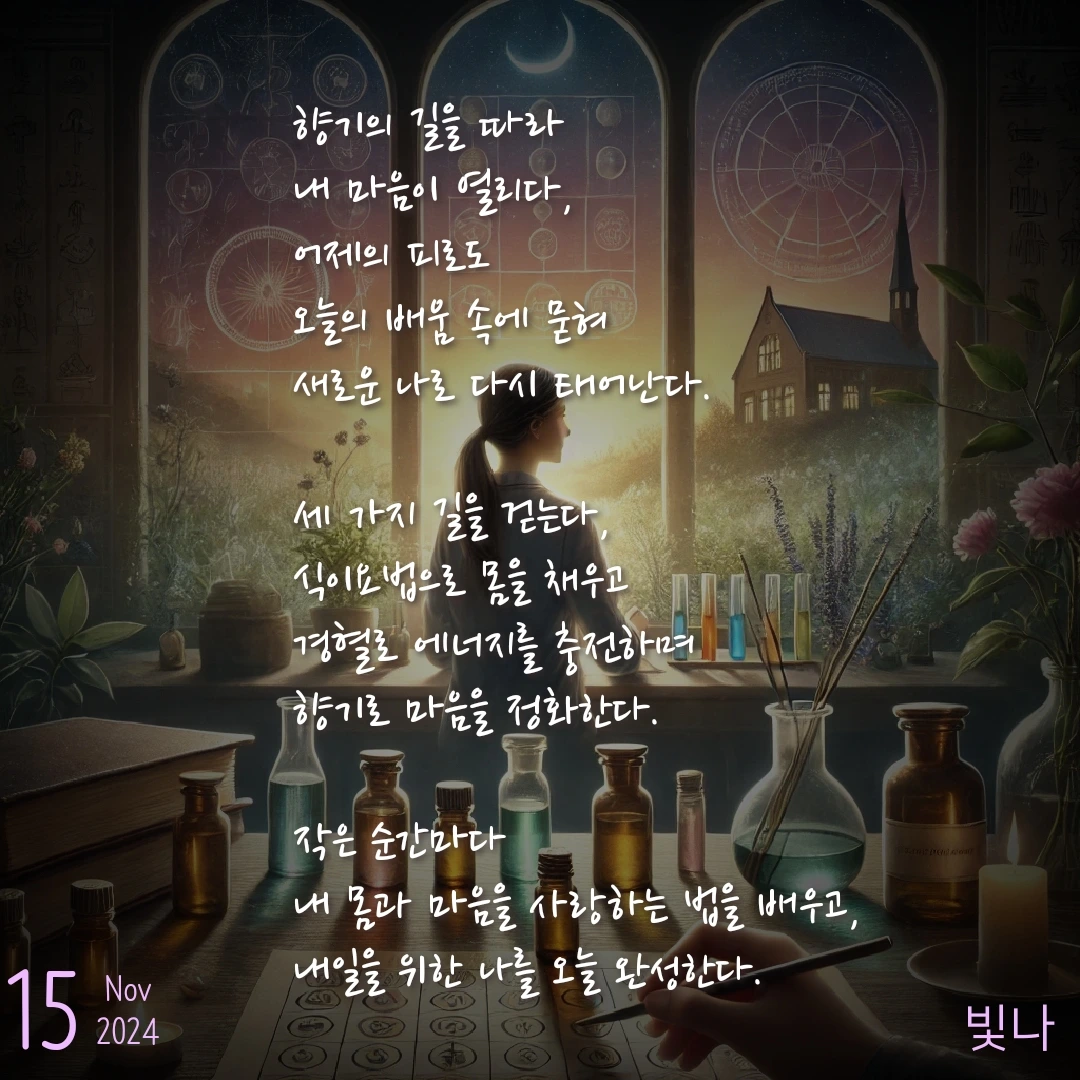 수업이 끝난 후, 오늘 배운 것들을 정리하면서, 짝꿍을 기다리며 문득 생각했다. 오늘 하루는 향기와 몸을 돌보는 방법을 함께 배운 아주 의미 있는 시간이었다.