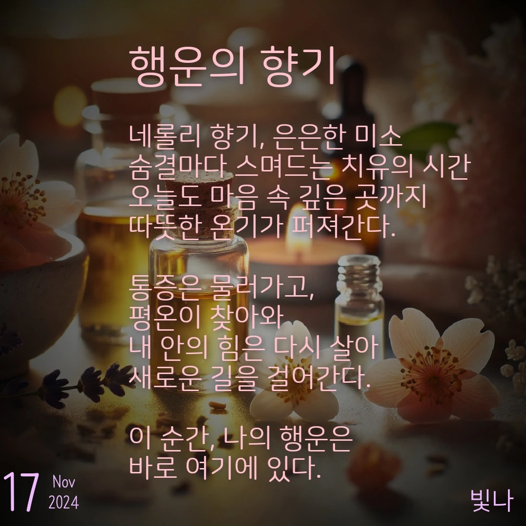 감성과 치유의 언어로 마음을 물들이는 큐레이터.나만의 속도와 빛깔로, 따뜻한 향기로 이야기를 엽니다.비공식 연락은 정중히 사양하며, 댓글 소통은 언제나 환영입니다 :)