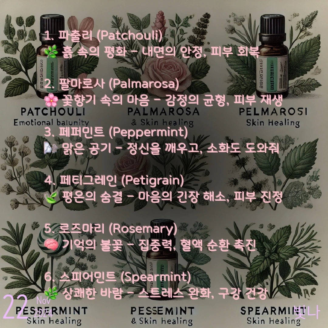 나루: "오늘 수업은 진짜 로즈마리 디퓨저 같았어. 머릿속이 활활 돌아가는데, 자료들 하나하나가 퍼즐처럼 딱딱 맞춰지는 거 있지? 집에 와서 스피어민트 한 번 맡으니까 피로가 살짝 풀리긴 했는데, 진정은 결국 파출리가 하더라. 향은 역시 안목이 있어야 해."