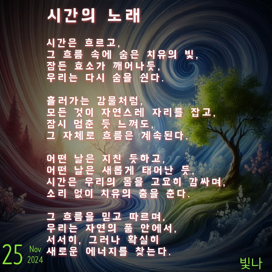 “시간은 결국 그 흐름에 맡겨야 해. 우리가 그 흐름을 믿고 따라가면, 자연스럽게 치유가 일어나고, 성장도 가능해. 그 아이들도 결국엔 그 흐름을 타고 더 빛날 거야. ‘시간’은 지나가지만, 그 속에서 우리는 계속 변화하고, 치유될 거야.”